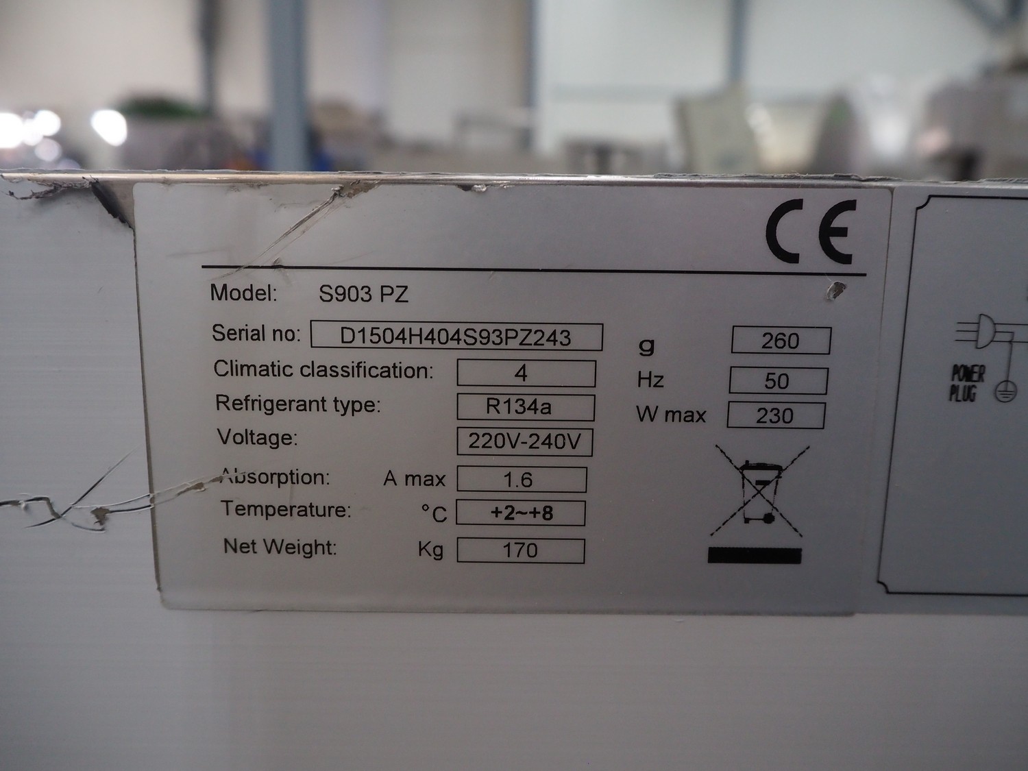 S/s 3-door refrigerator, model: S903 PZ, serial number: D1504H404S93PZ243, 220/240 V, 50 Hz, 1.6 A, 230 W, refrigerant: R134a, weight: 170 kg, dimensions: 1400 mm x 700 mm x 830 mm.