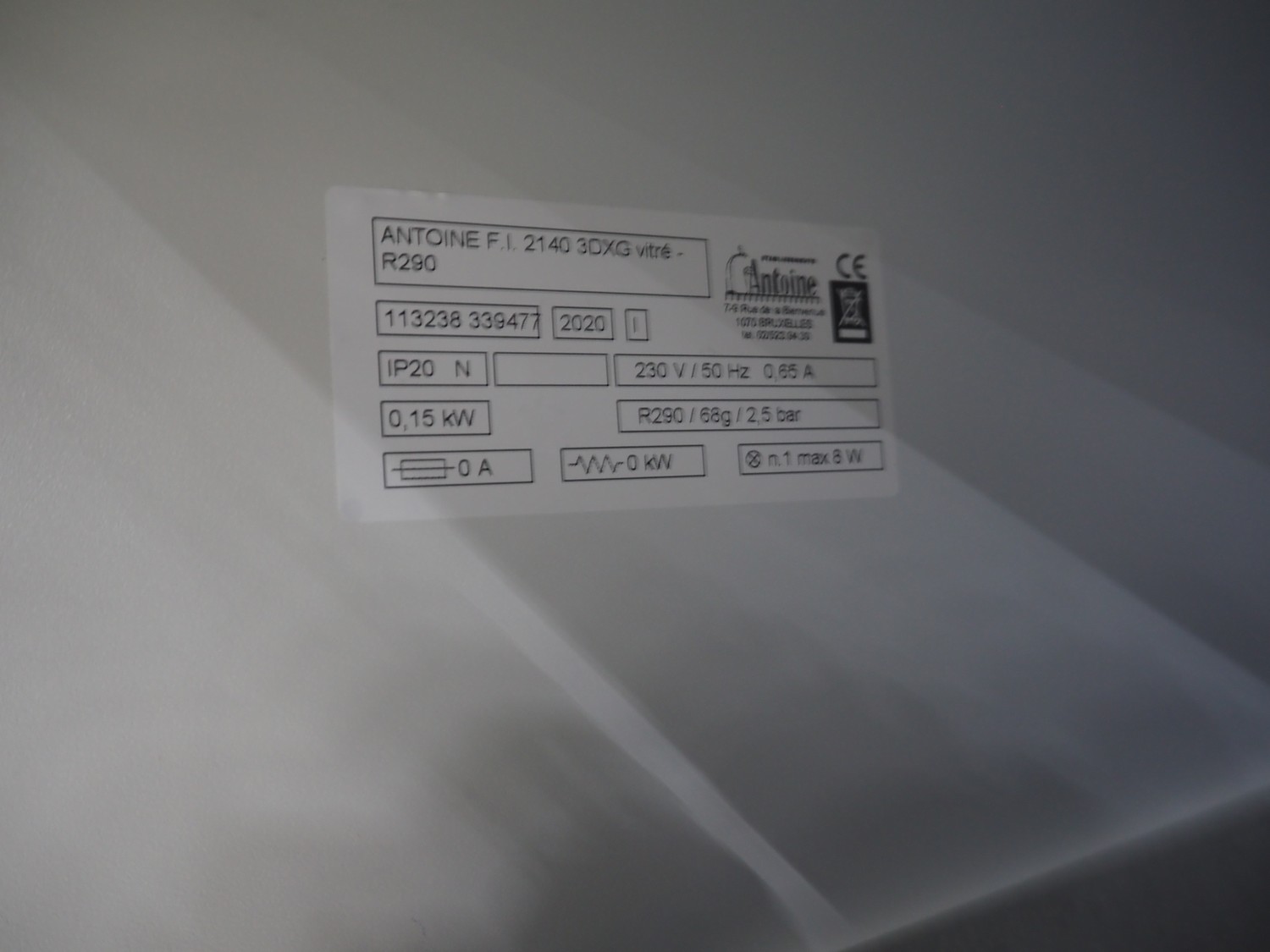 Antoine 3-doors refrigerator, type: ANTOINE F.I. 2140 3DXG vitré - R290, number: 113238 339477, year of construction: 2020, 230 V, 50 Hz, 0.65 A, 0.15 kW, refrigerant: R290, 68 gram, dimensions: 2150 mm x 550 mm x 820 mm.