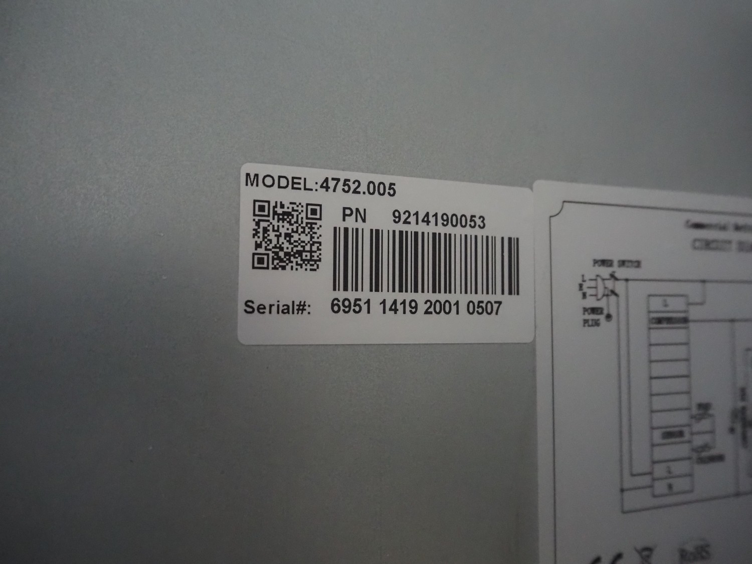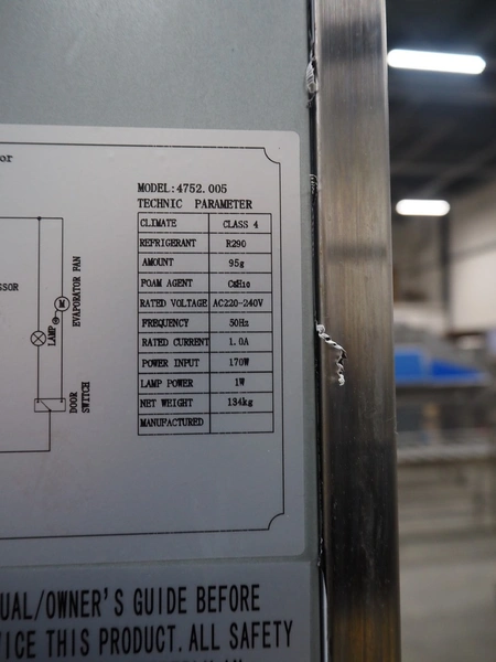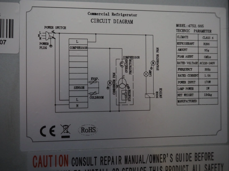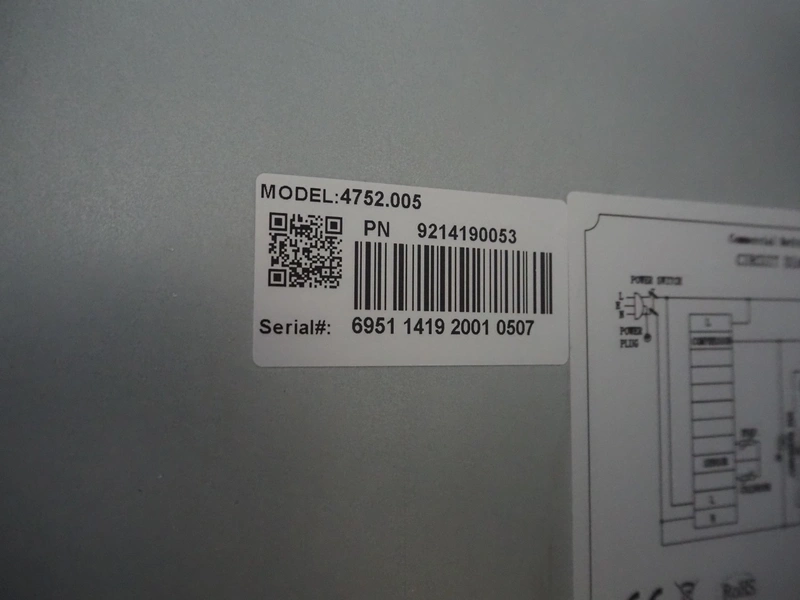 Ecofrost refrigerator, model: 4752. 005, serial number: 6951 1419 2001 0507, 220/240 V, 50 Hz, 1 A, 170 W, refrigerant: R290, 95 g, weight: 134 kg, 5 floors, dimensions each floor: 650 mm x 520 mm, total dimensions: 740 mm x 840 mm x 2000 mm.