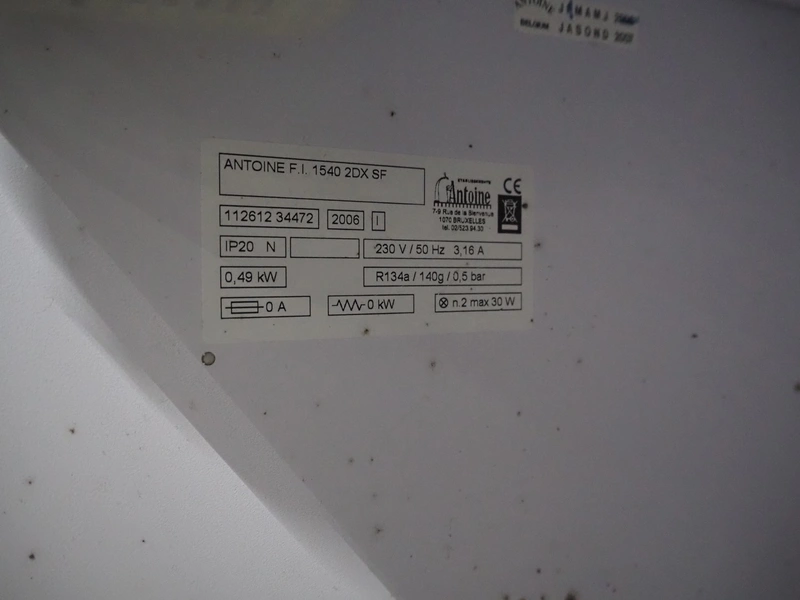 Antoine refrigerator, type: 1540 2DX SF, number: 112662 273358, year of construction: 2017, 230 V, 50 Hz, 3.16 A, 0.49 kW, refrigerant: R134a, 140 gram, floor dimensions: 490 mm x 390 mm, total dimensions: 1550 mm x 560 mm x 850 mm.