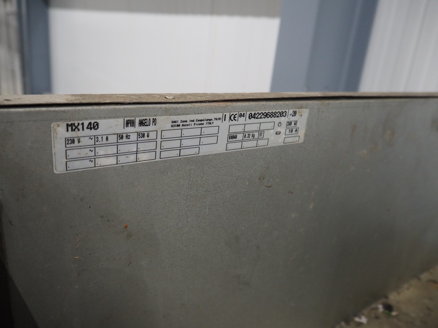 Angelo Po 2-doors refrigerator, type: MX140, serial number: 04229688203, 230 V, 50 Hz, 3.1 A, 530 W, refrigerant; R404A / 0.32 kg, dimensions: 1500 mm x 790 mm x 2000 mm.