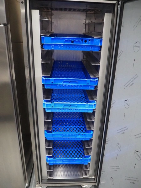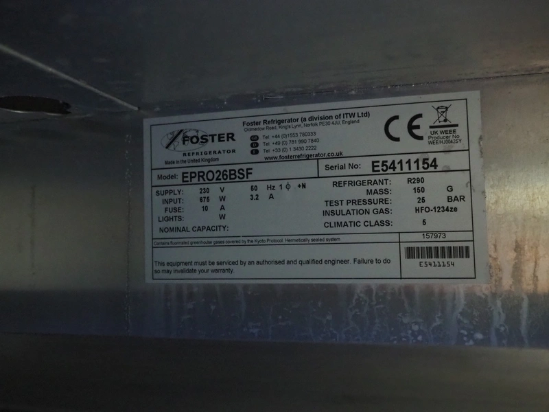 Foster mobile refrigerator, model: EPRO25BSF, serial number: E5411154, 230 V, 1 Ph, 50 Hz, 3.2 A, 675 W, refrigerant: R290, 150 gram, 16 floors, 5 plastic crates, crate dimensions: 760 mm x 450 mm x 90 mm, total dimensions: 700 mm x 930 mm x 2270 mm.