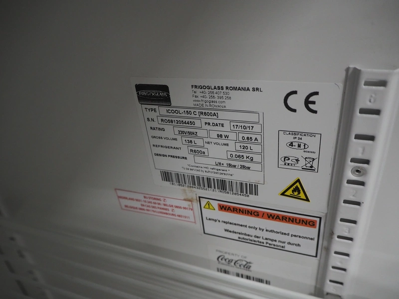 Frigoglass Romania SRL refrigerator, type: ICOOL-150C, serial number: RO5812054450, year of construction: 17/10/17, 230 V, 50 Hz, 0.65 A, 98 W, volume: 120 liter, refrigerant: R600a/0.065 kg, dimensions each floor: 370 mm x 400 mm, total dimensions: 600 mm x 500 mm x 900 mm.