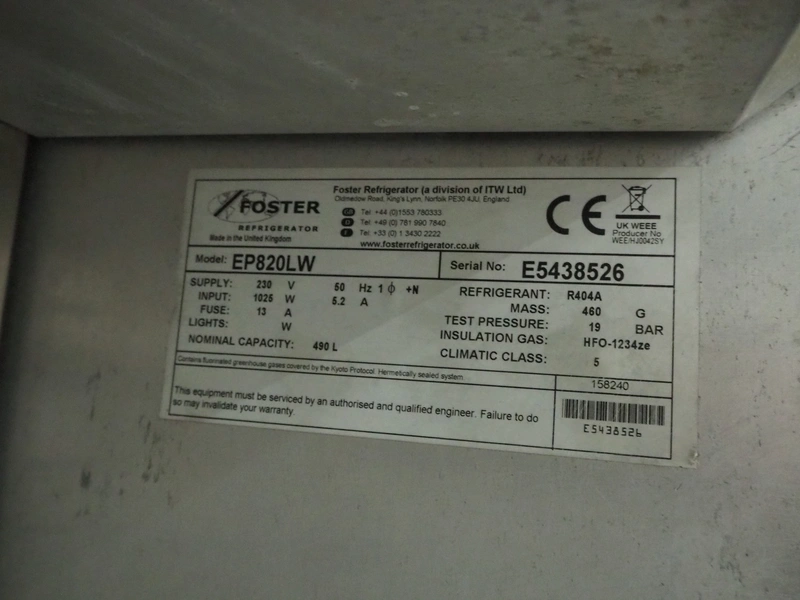 Foster mobile refrigerator, model: EP820LW, serial number: E5438526, 230 V, 1 Ph, 50 Hz, 5.2 A, 1025 W, refrigerant: R404a, 4 floors, dimensions each floor: 540 mm x 650 mm, total dimensions: 800 mm x 700 mm x 2050 mm.