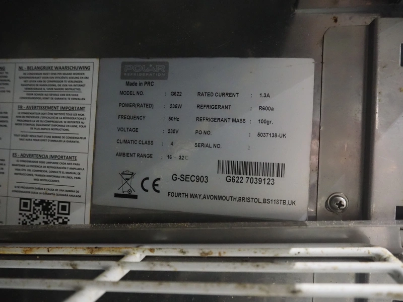 Polar 3-doors refrigerator, model: G622, 230 V, 50 Hz, 1.3 A, 235 W, refrigerant: R600a / 100 gram, dimensions: 1370 mm x 700 mm x 900 mm.