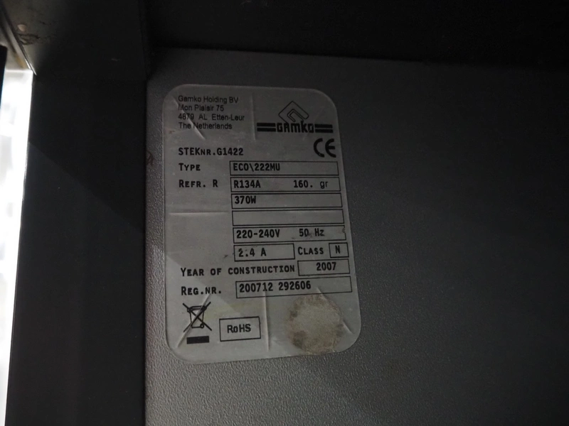 Gamko refrigerator, type: ECO/222MU, year of construction: 2007, 220/240 V, 50 Hz, 370 W, refrigerant: R134A / 160 gram, floor dimensions: 370 mm x 480 mm, total dimensions: 800 mm x 2000 mm x 1040 mm.