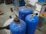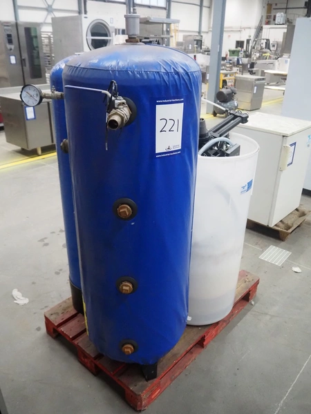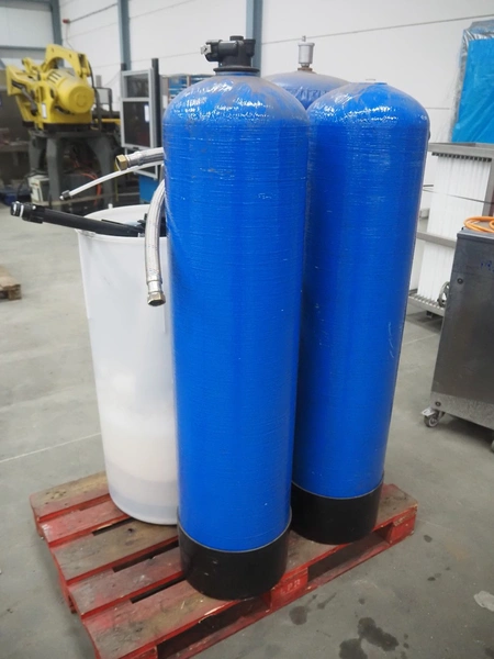 Pallet with water softener, consisting of 3 vessels and 1 plastic bin.