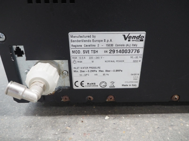 SandenVendo Europe S.p.A. coffee machine, model: SVE TSH, serial number: 2914003776, year of construction: 04/2019, 220-240 V, 50-60 Hz, 3200 Watt, dimensions: 420 mm x 490 mm x 365 mm.