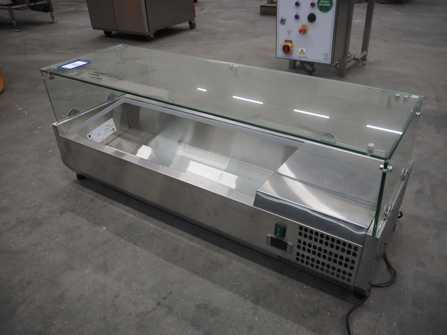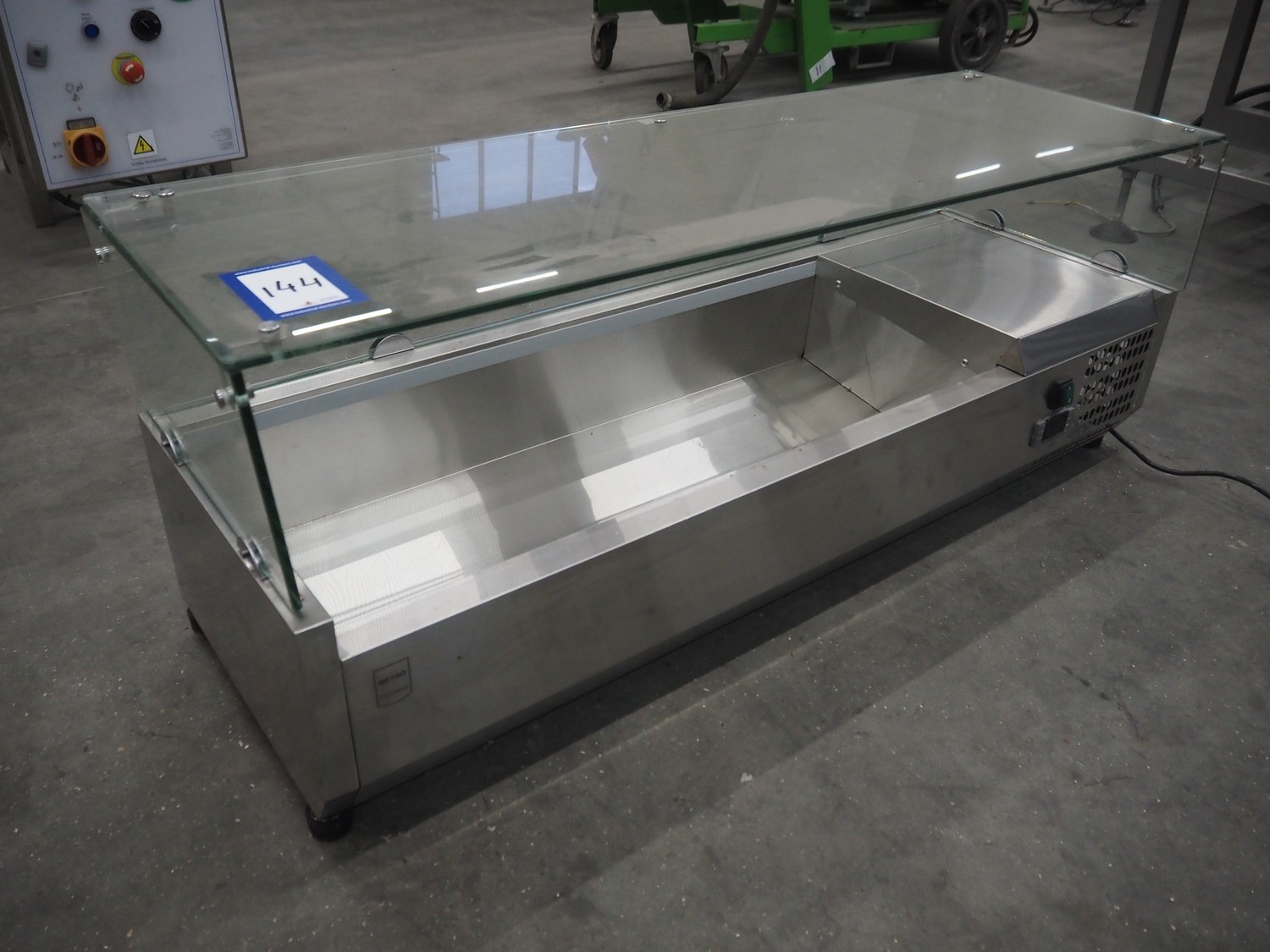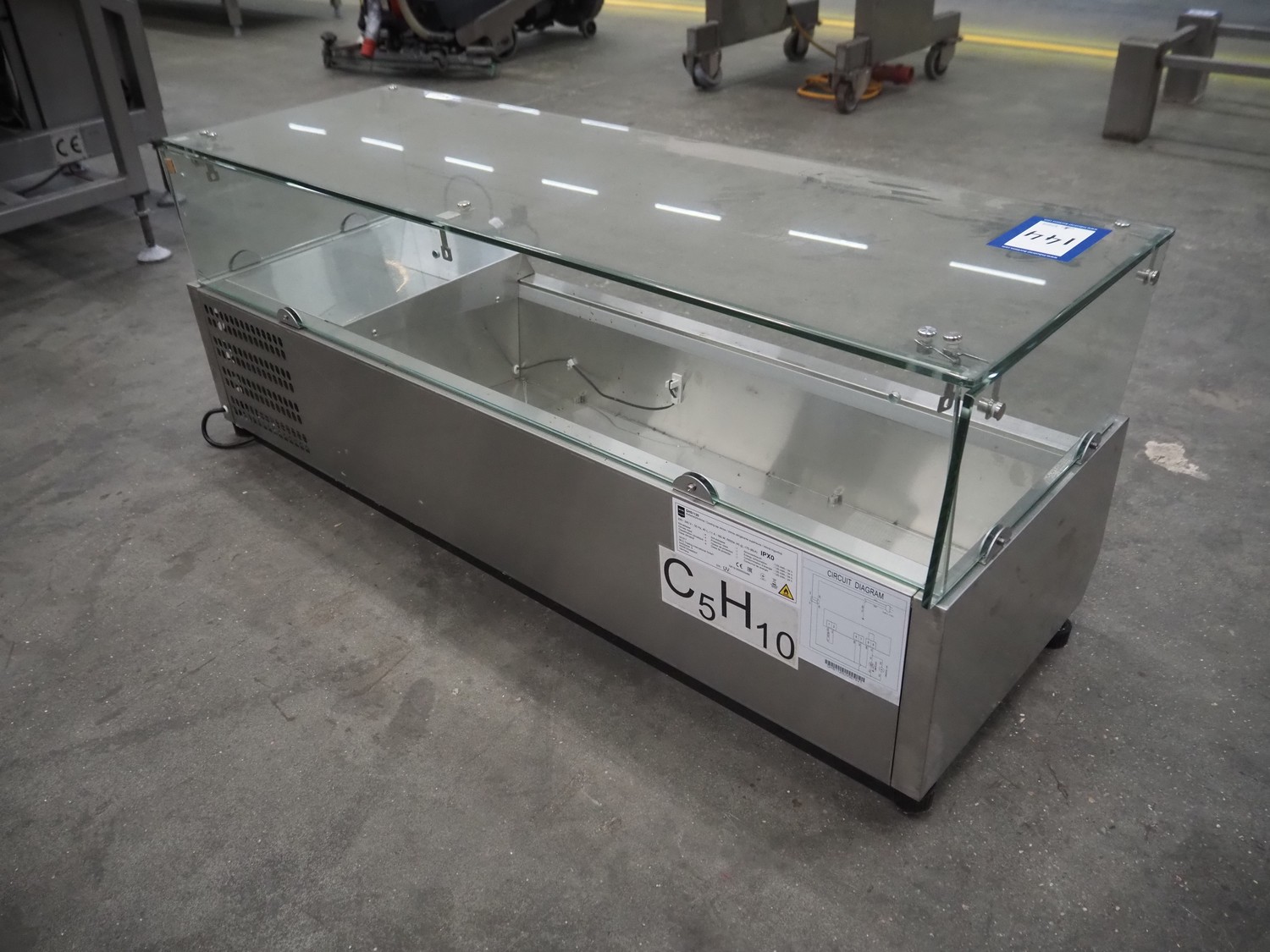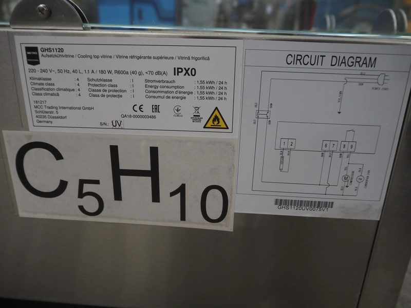Metro refrigerated showcase, type: GHS1120, 220/240 V, 50 Hz, 1.1 A, 180 W, refrigerant: R600a, dimensions: 1200 mm x 400 mm x 470 mm.