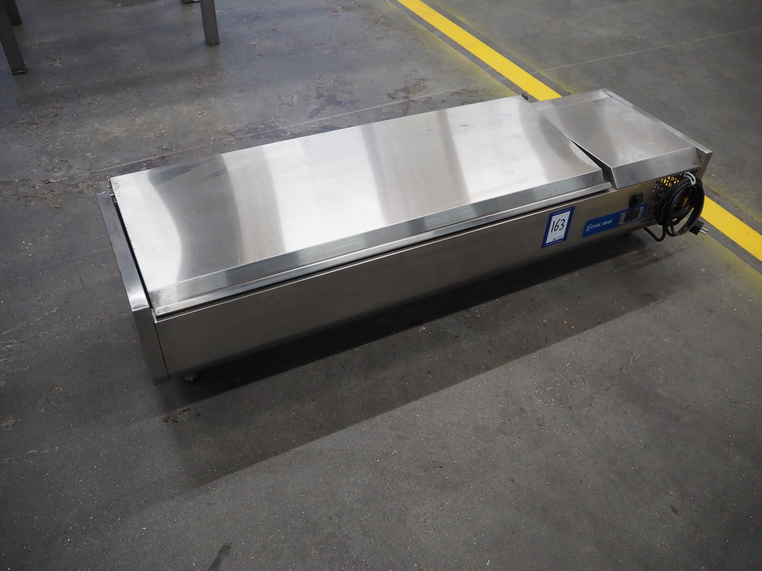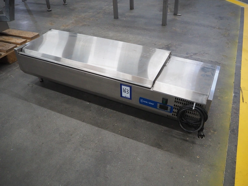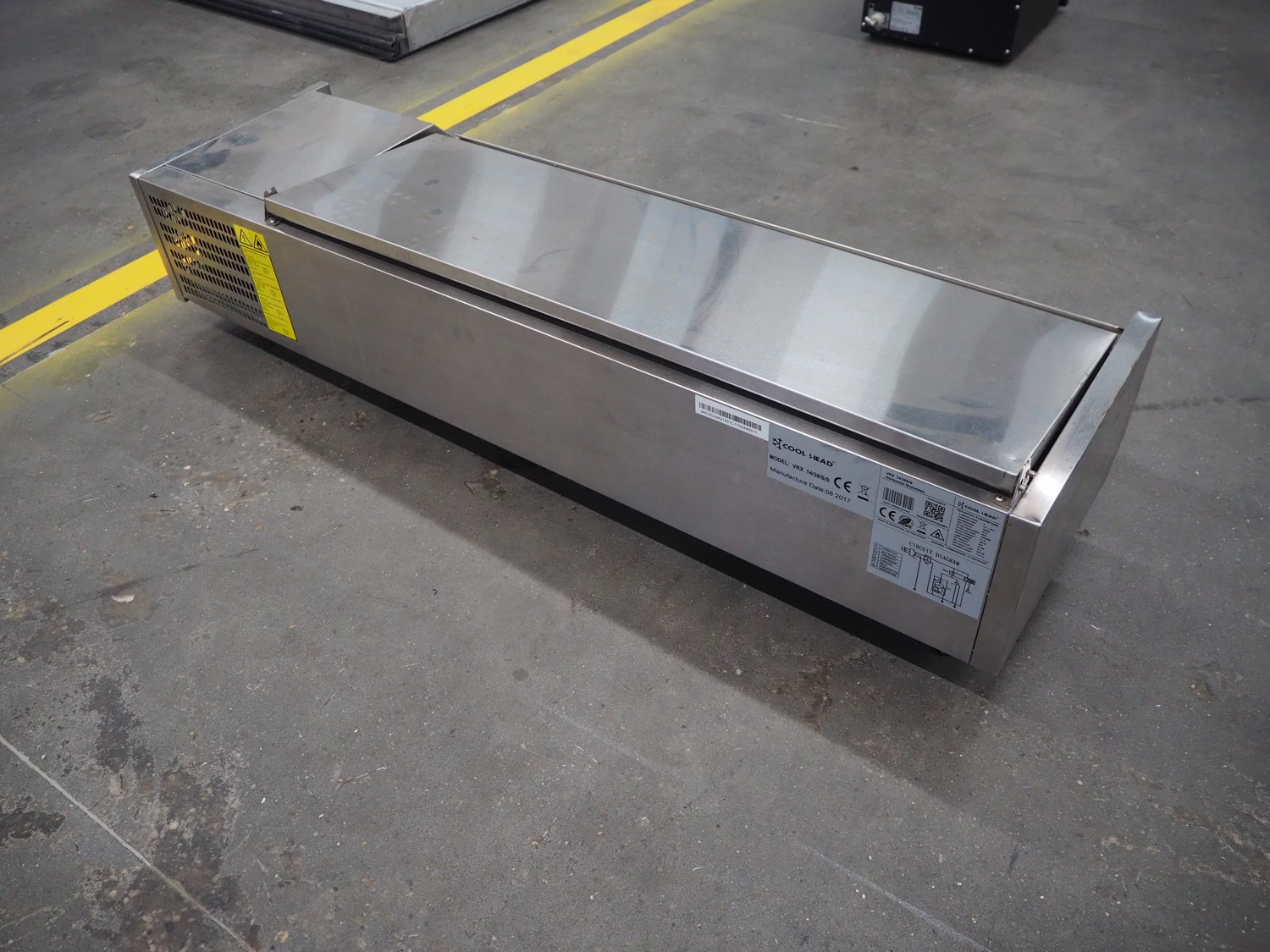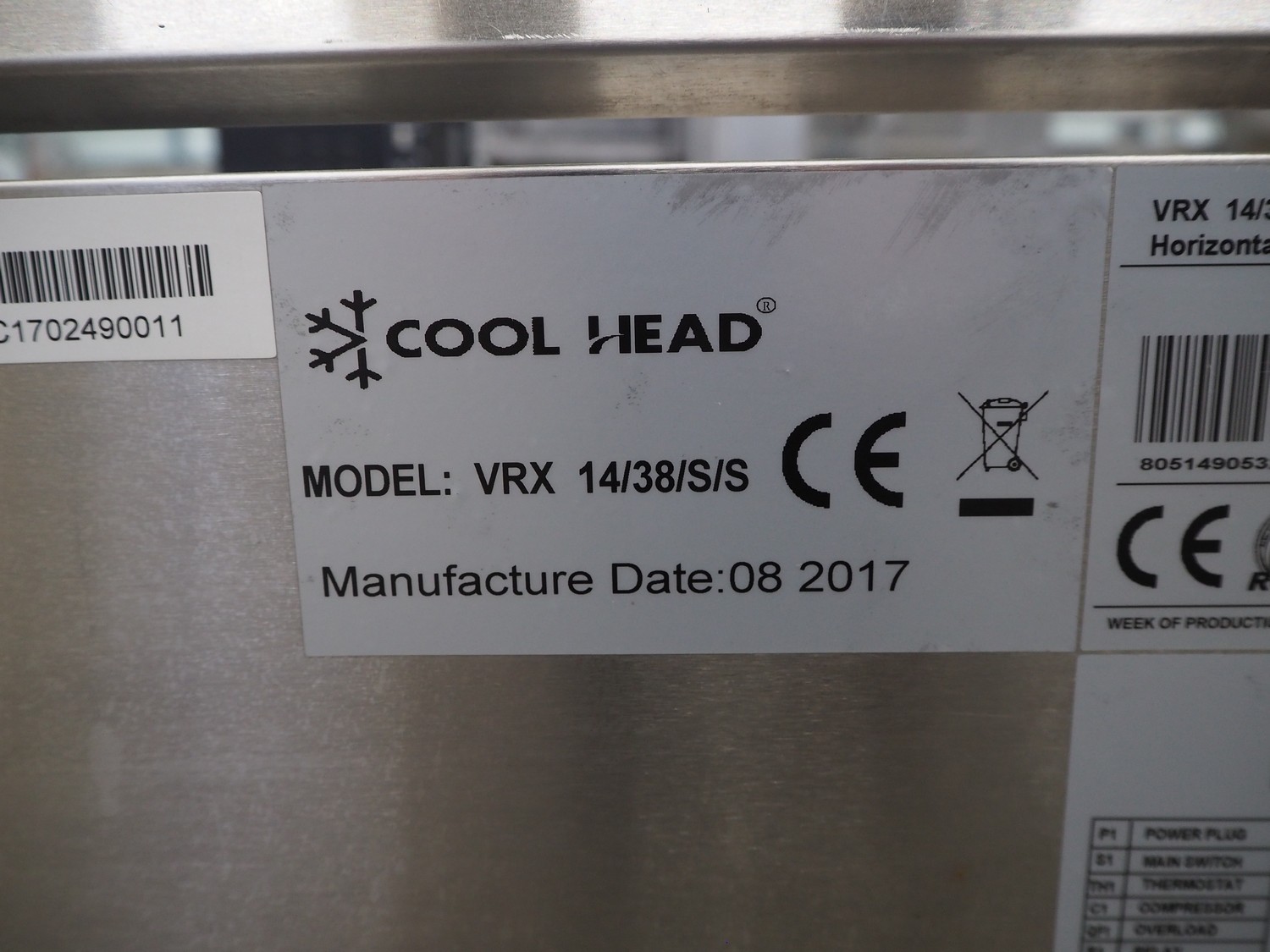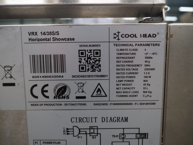 Cool Head refrigerated showcase, model: VRX 14/38/S/S, year of construction: 08/2017, 220/240 V, 50 Hz, 1.3 A, 160 W, refrigerant: R600a / 40 g, weight: 42 kg, volume: 53 liter, dimensions: 1450 mm x 395 mm x 360 mm.