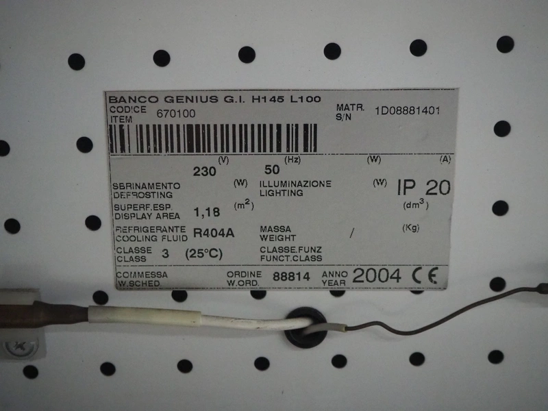 Arneg refrigerated showcase, model: Banco Genius G.I. H145 L100, serial number: 1D08881401, year of construction: 2004, 230 V, 50 Hz, refrigerant: R404A, dimensions: 1000 mm x 700 mm x 1450 mm.