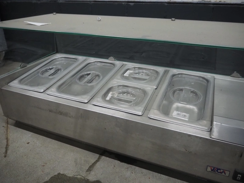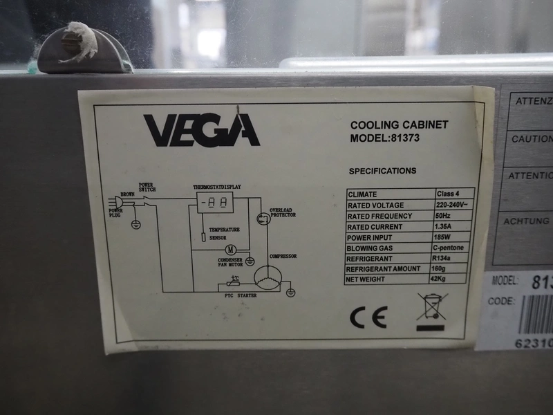 Vega refrigerated showcase, model: 81373, 220/240 V, 50 Hz, 1.35 A, 185 W, refrigerant: R134a, 160 g, weight: 42 kg, dimensions: 1200 mm x 400 mm x 470 mm.