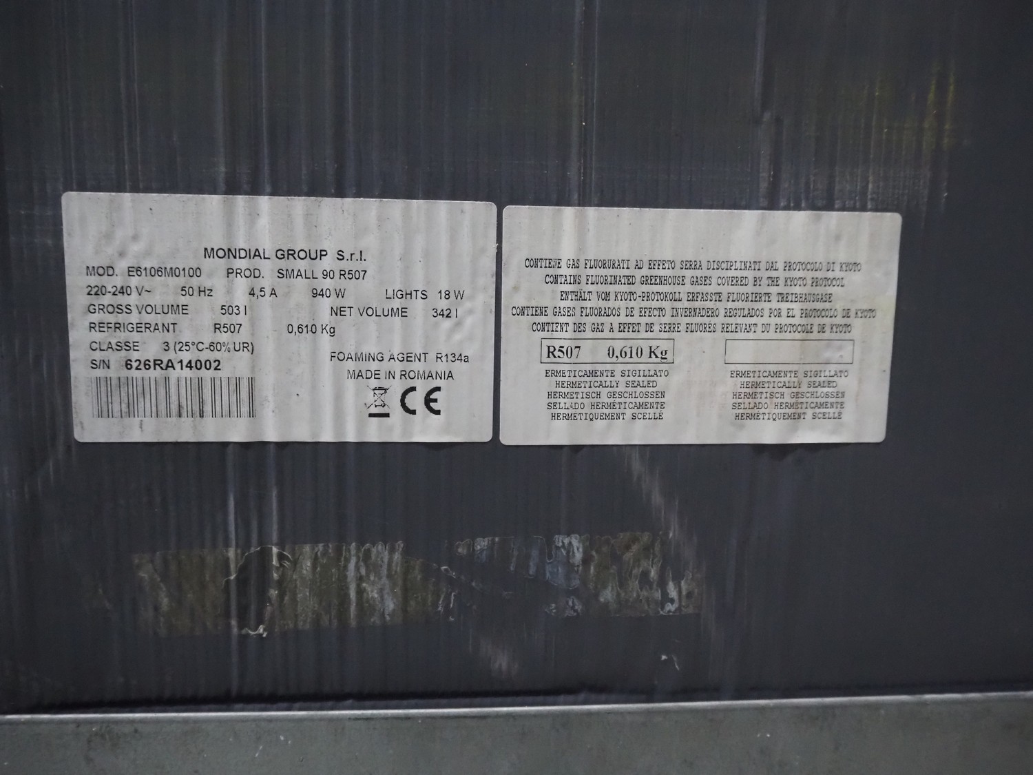 Mondial Group S.r.l. refrigerated showcase, type: E6106M0100, number: 626RA14002, 220/240 V, 50 Hz, 4.5 A, 940 W, refrigerant: R507, total dimensions: 600 mm x 980 mm x 2020 mm.