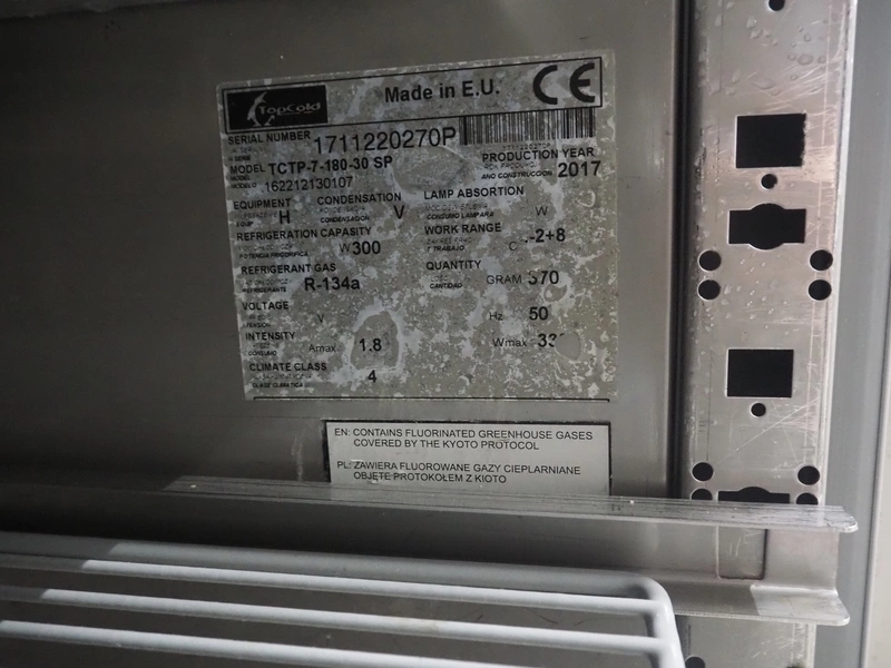 Top Cold refrigerated counter, model: TCTP-7-180-30 SP, serial number: 1711220270P, year of construction: 2017, 50 Hz, refrigerant: R-134a, 370 gram, floor dimensions: 570 mm x 330 mm, total dimensions: 1800 mm x 700 mm x 900 mm.