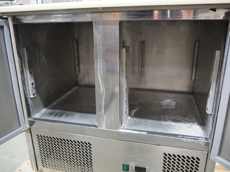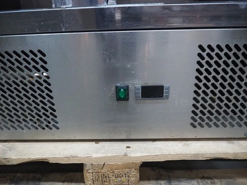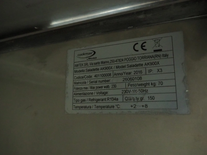 Cookmax saladette, model: Saladette AK900X, serial number: 26060108, year of construction: 2016, 230 V, 1 Ph, 50 Hz, refrigerant: R134a, temperature: 2-8 ⁰C, weight: 70 kg, dimensions inside: (2x) 550 mm x 330 mm, total dimensions: 910 mm x 710 mm x 850 mm.