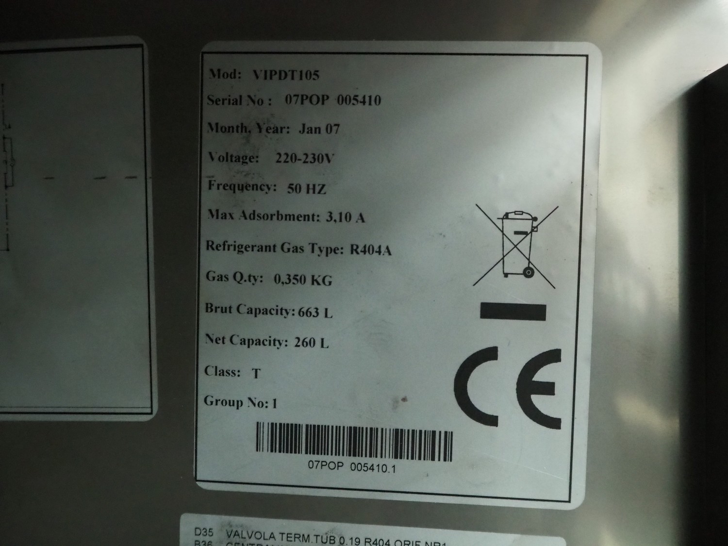 Refrigerated counter, model: VIPDT105, serial number: 07POP 005410, year of construction: jan 07, 220-230 V, 50 Hz, 3.1 A, refrigerant: R404A, capacity: 260 liter, dimensions: 1100 mm x 700 mm x 880 mm.