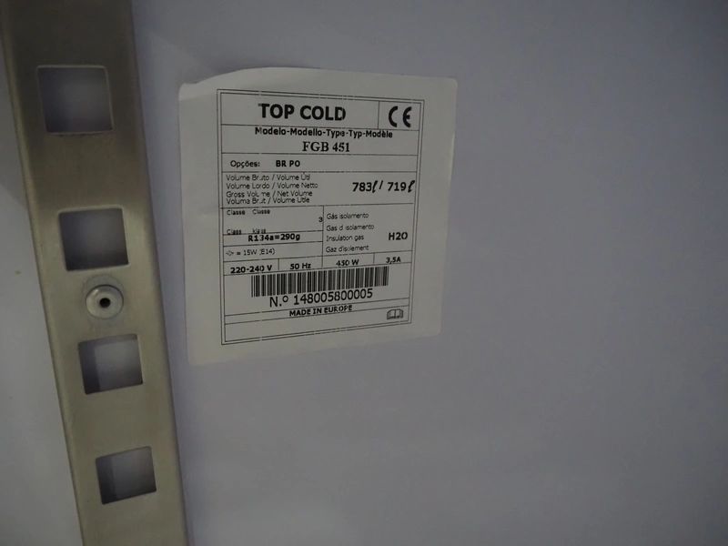Top Cold refrigerated cabinet, model: FGB 451, number: 148005800005, 220-240 V, 50 Hz, refrigerant: R134a/290 g, dimensions: 2780 mm x 560 mm x 850 mm.