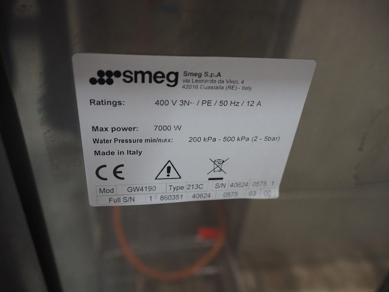 SMEG dishwasher, type: GW4190, serial number: 40624, 400 V, 3 Ph, 50 Hz, 12 A, 7000 W, dimensions: 900 mm x 600 mm x 850 mm.