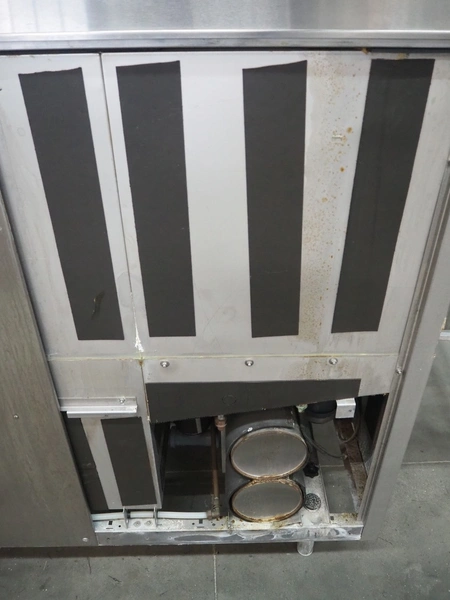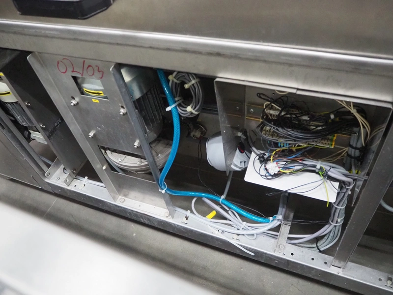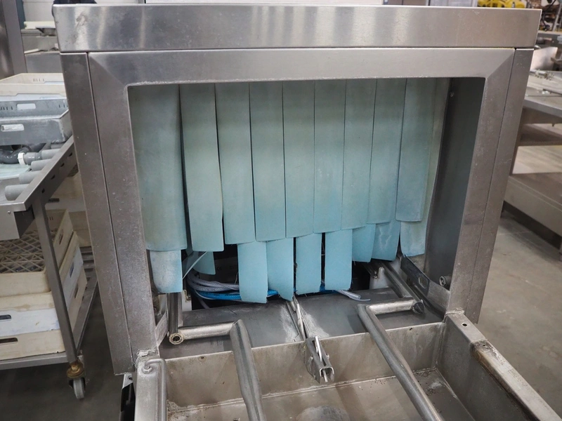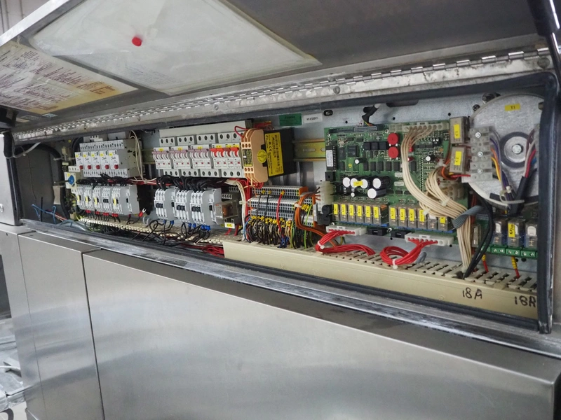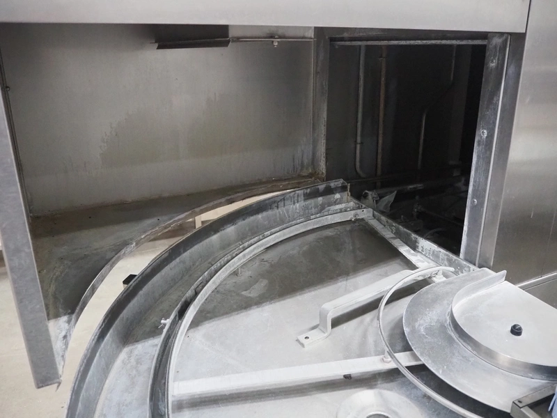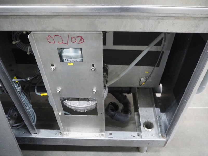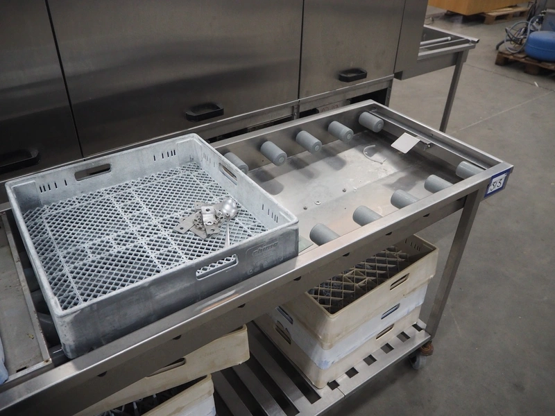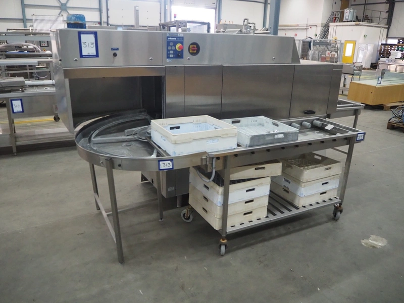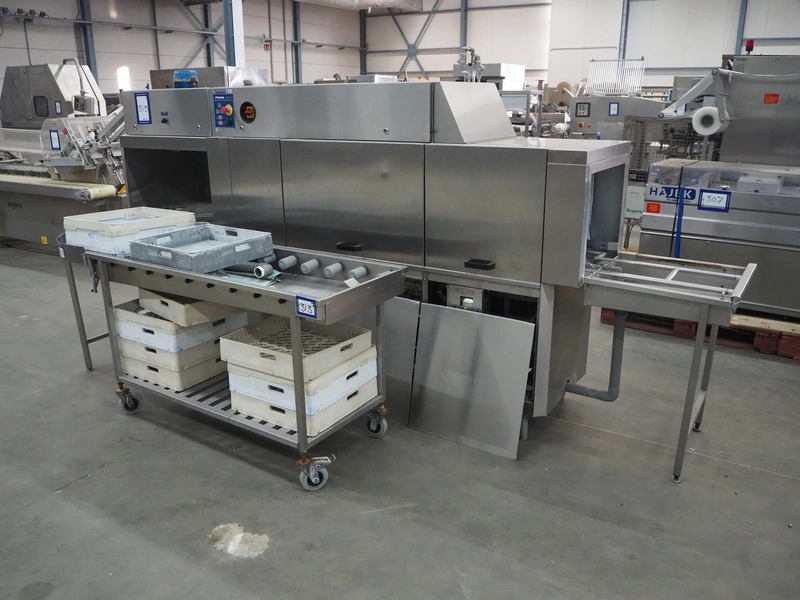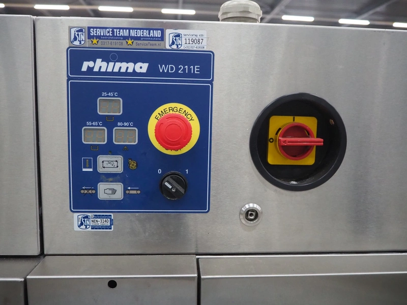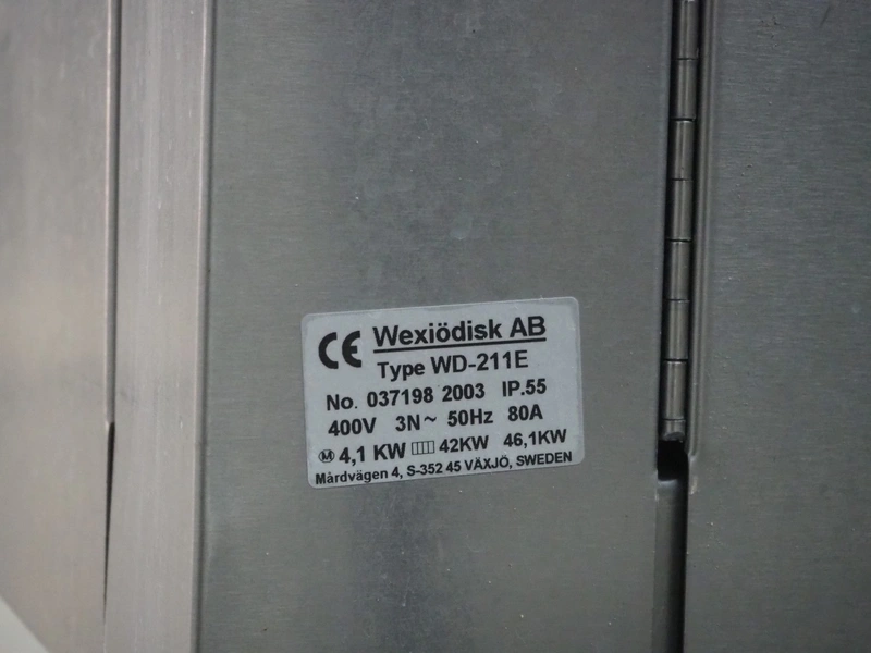 Rhima/Wexiödisk AB dishwasher with infeed roller conveyor, type: WD-211E, number: 037198, year of construction: 2003, 400 V, 3 Ph, 50 Hz, 80 A, 42 kW, dimensions: 3400 mm x 1400 mm x 1800 mm.