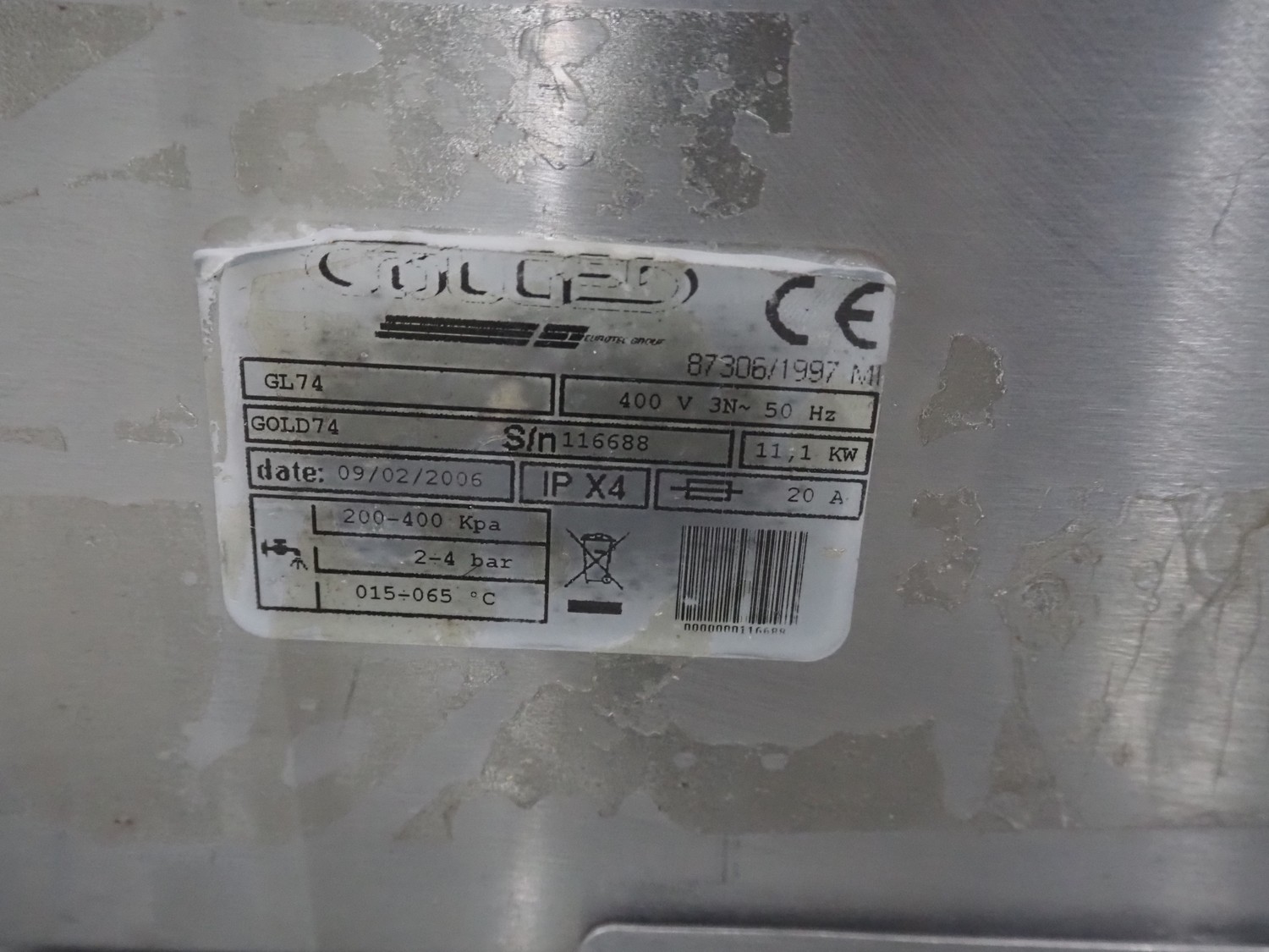 Colged dishwasher, type: Gold74, serial number: 116688, year of construction: 09/02/2006, 400 V, 3 Ph, 50 Hz, 11.1 kW, inside dimensions: 500 mm x 500 mm x 320 mm, total dimensions: 700 mm x 800 mm x 1300 mm.