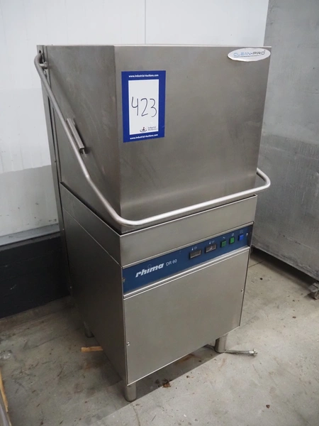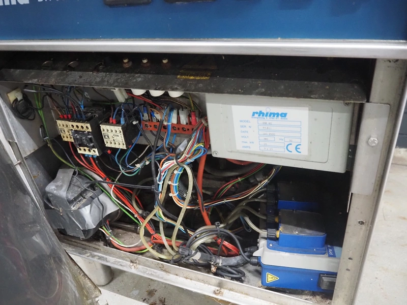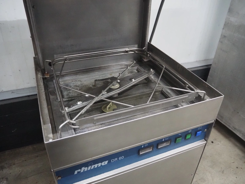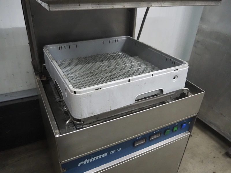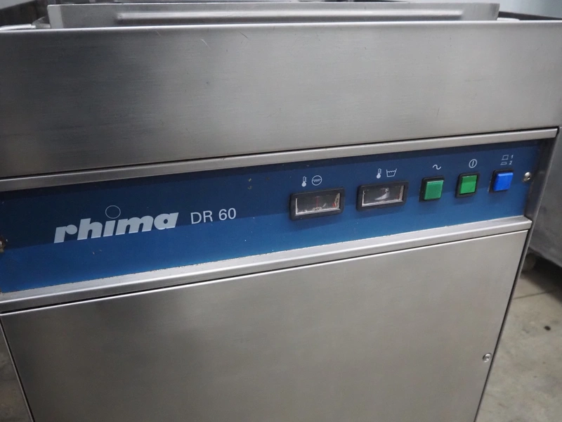 Rhima dishwasher, model: DR 60, serial number: 95.811, year of construction: 2000, 380 V, 3 Ph, 50 Hz, 25 A, 10 kW, dimensions: 800 mm x 700 mm x 1450 mm.
