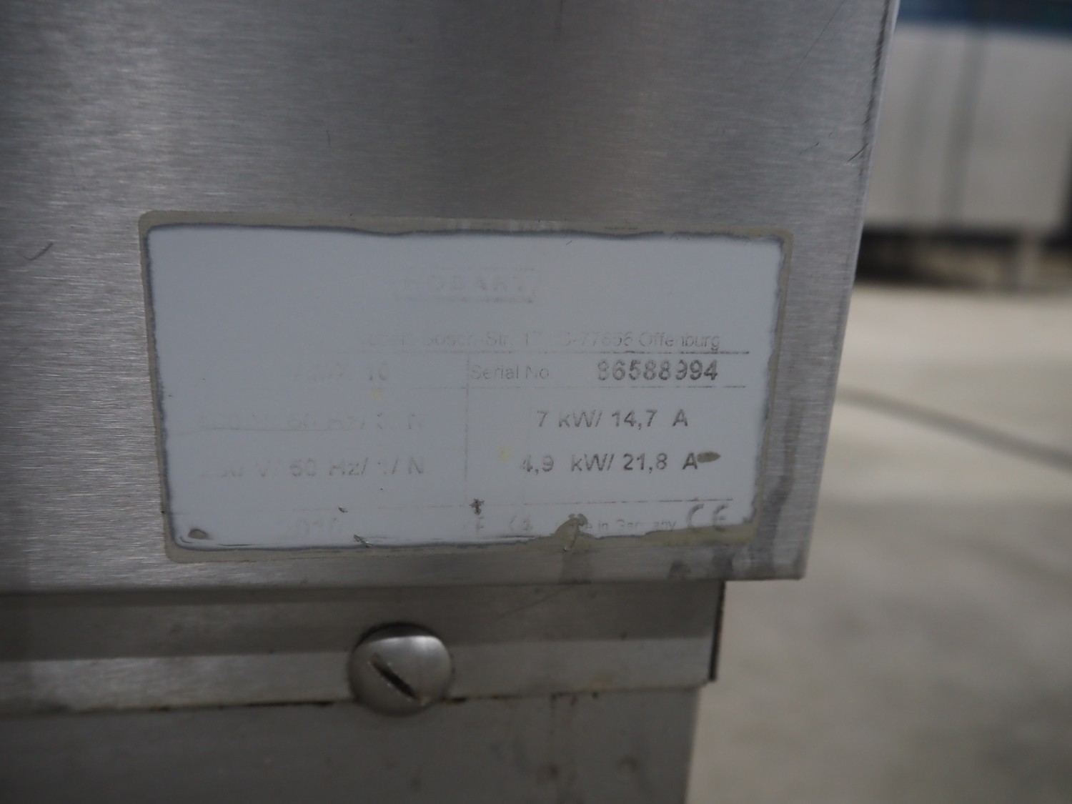 Hobart dishwasher, serial number: 86588994, 50 Hz, 14.7/21.8 A, 7/4.9 kW, inside dimensions: 500 mm x 500 mm x 400 mm, total dimensions: 760 mm x 850 mm x 1520 mm.