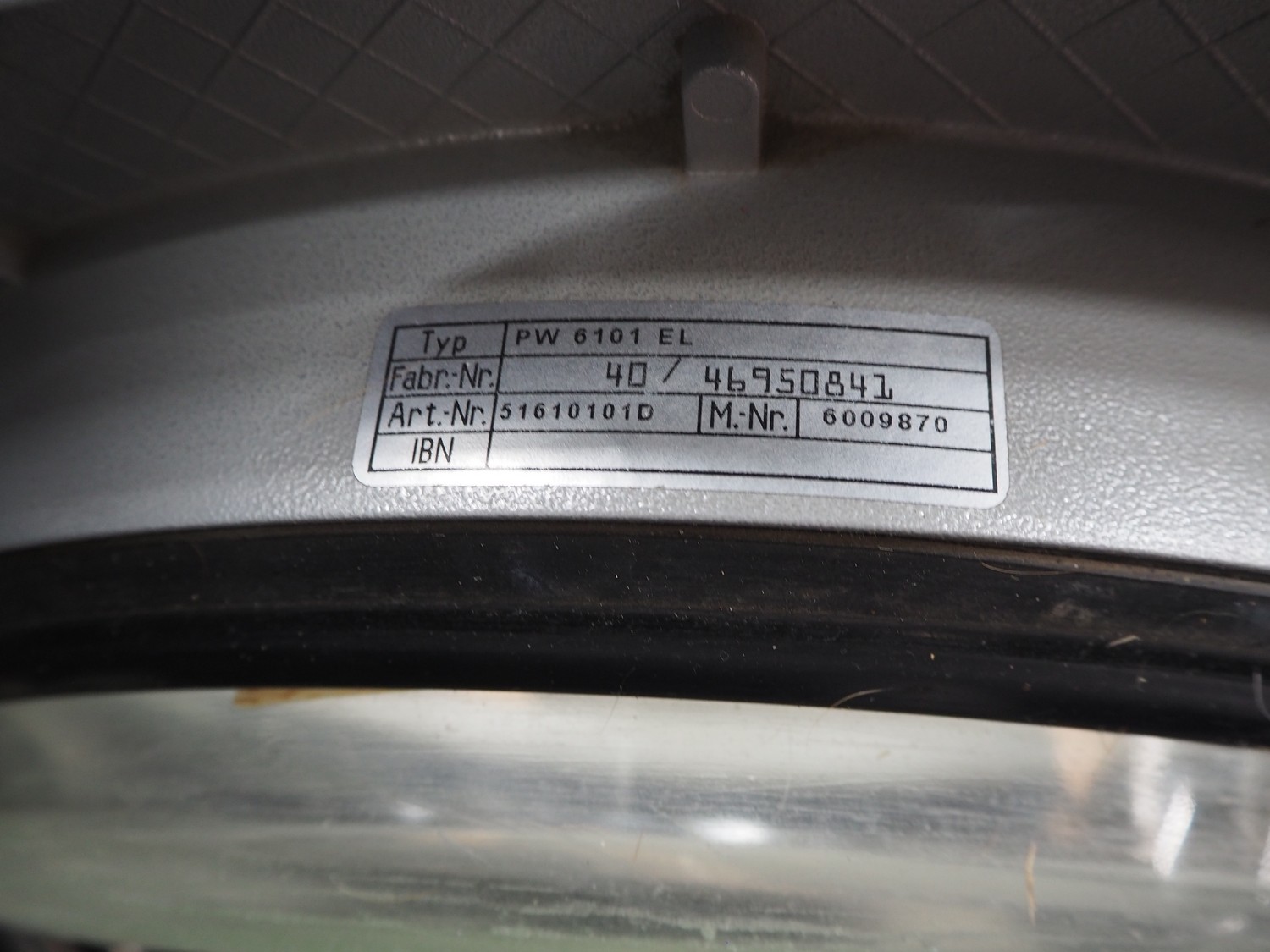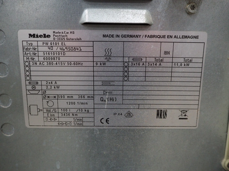Miele dryer, type: PW 6101 EL, machine number: 6009870, 380/415 V, 3 Ph, 50/60 Hz, 16 A, 9 kW, dimensions: 920 mm x 820 mm x 1220 mm.