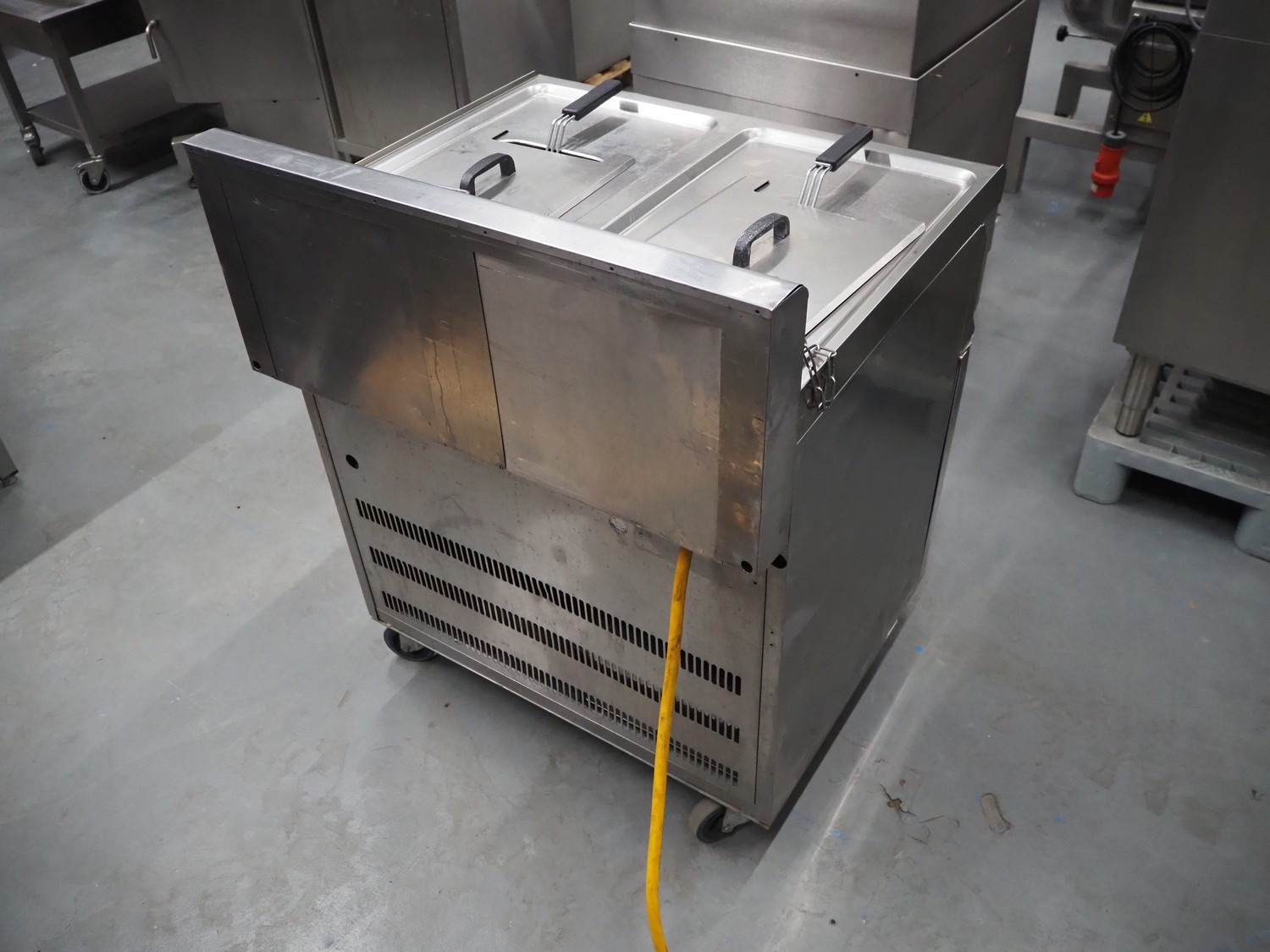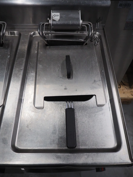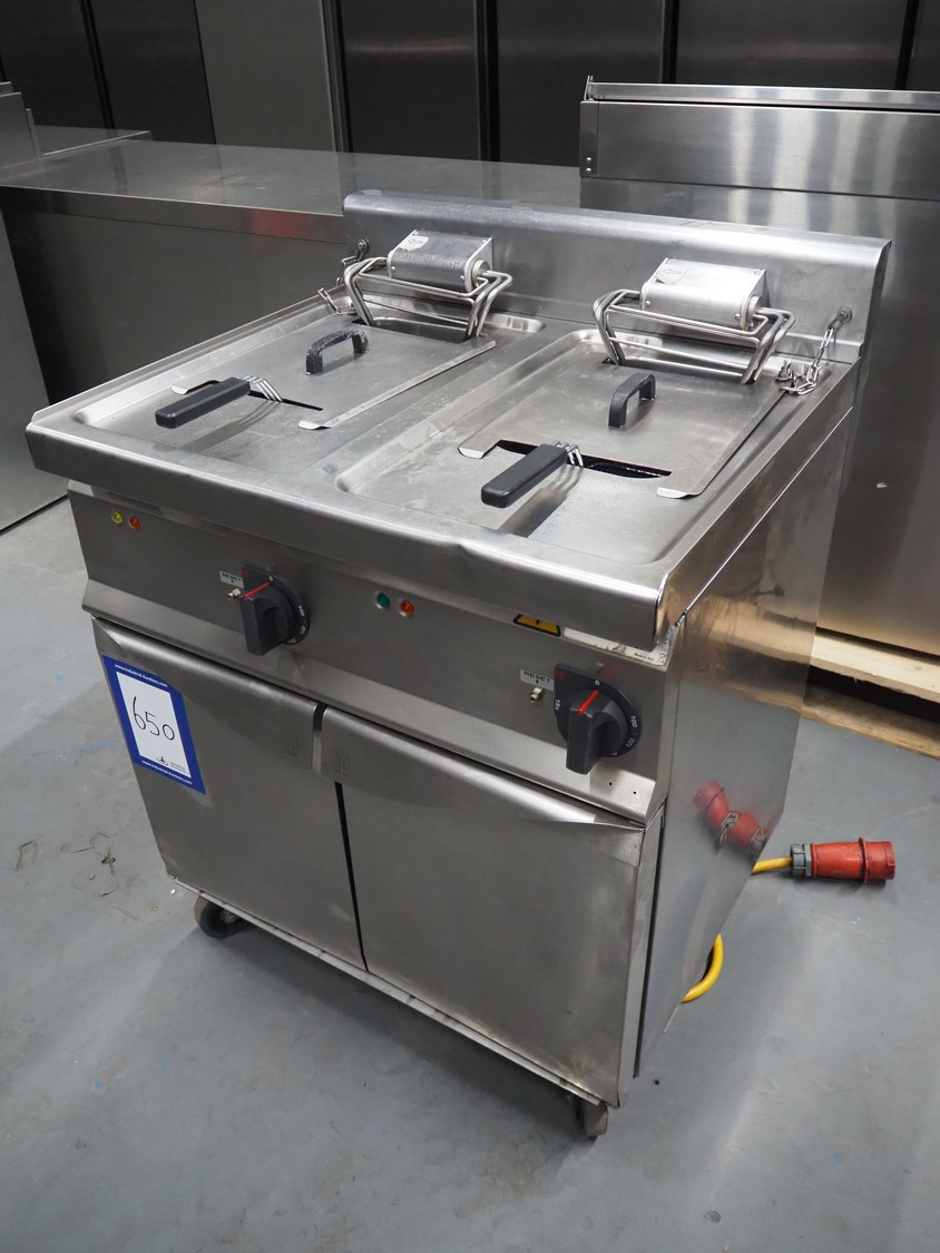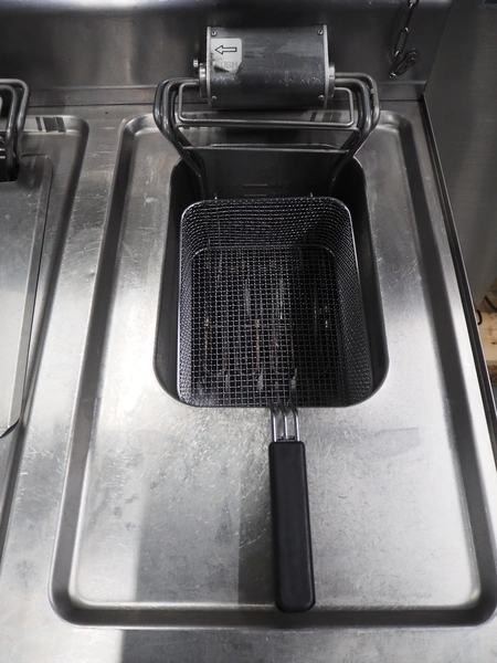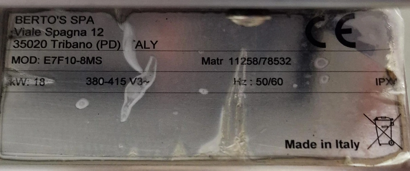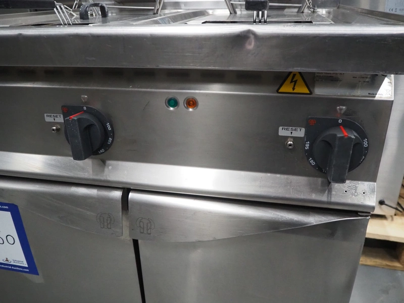 Berto's SPA double fryer, model: E7F10-8MS, number: 11258/78532, 380/415 V, 3 Ph, 50/60 Hz, 18 kW, inside dimensions: (2x) 230 mm x 340 mm x 150 mm, total dimensions: 800 mm x 700 mm x 1040 mm.