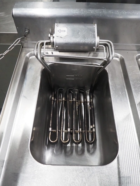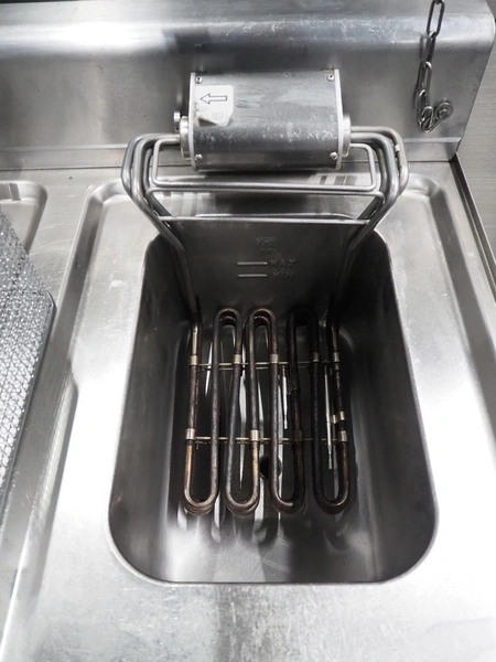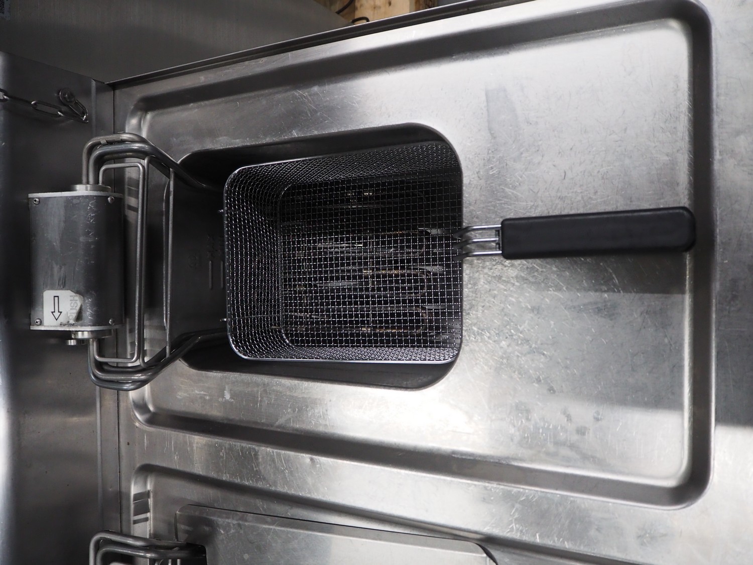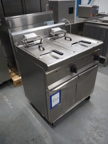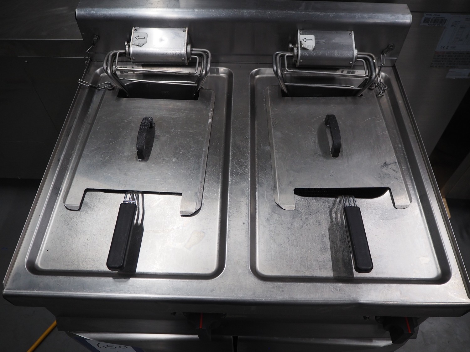 Berto's SPA double fryer, model: E7F10-8MS, number: 11258/78532, 380/415 V, 3 Ph, 50/60 Hz, 18 kW, inside dimensions: (2x) 230 mm x 340 mm x 150 mm, total dimensions: 800 mm x 700 mm x 1040 mm.