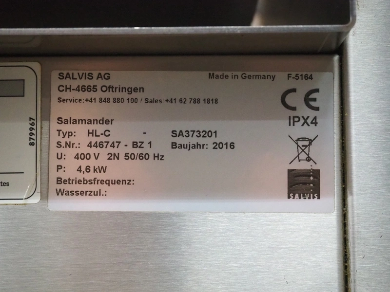 Salvis salamander grill, type: HL-C, serial number: 446747-BZ 1, year of construction: 2016, 400 V, 2 Ph, 50/60 Hz, 4.6 kW, dimensions heater: (2x) 295 mm x 160 mm, plate dimensions: 480 mm x 330 mm, total dimensions: 600 mm x 530 mm x 445 mm.