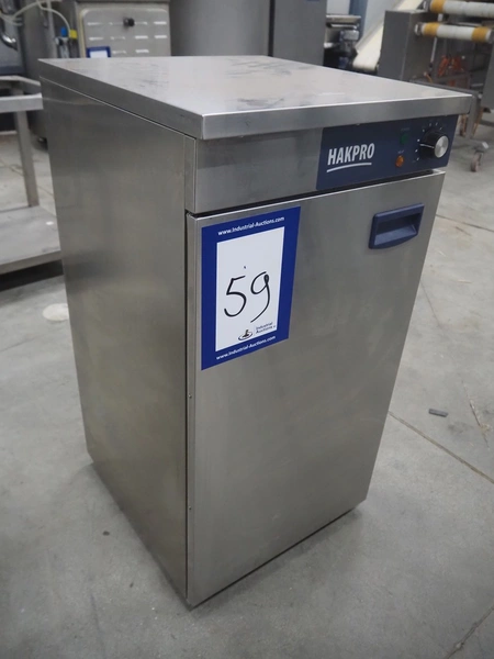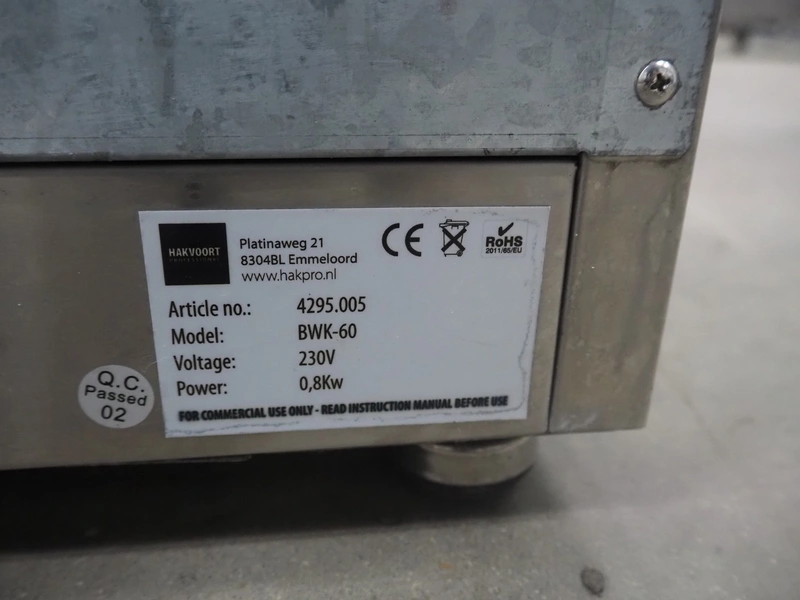 Hakvoort s/s heated cabinet, model: BWK-60, article number: 4295.005, 230 V, 0.8 kW, 4 floors, dimensions each floor: 380 mm x 400 mm, total dimensions: 485 mm x 450 mm x 870 mm.