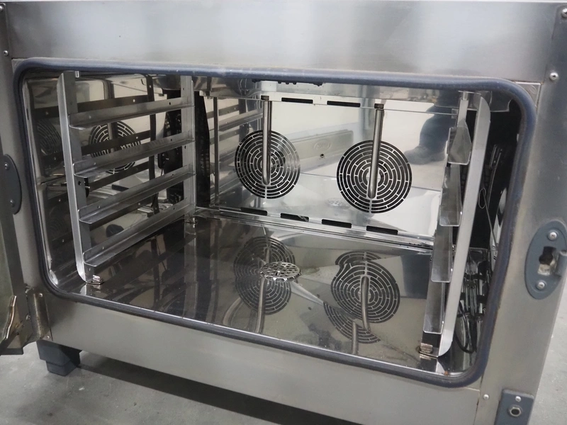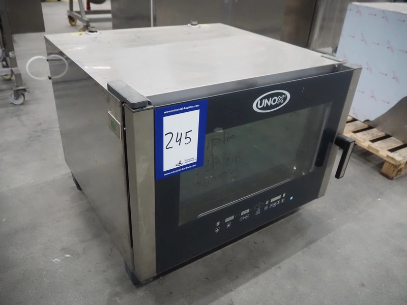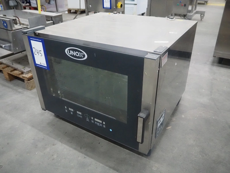 Unox combisteamer, type: XBC405E, serial number: 2015C0016006, 220-240/380-415 V, 1/3 Ph, 50/60 Hz, 7.5 kW, net weight: 60 kg, 4 floors, dimensions each floor: 360 mm x 600 mm, total dimensions: 860 mm x 560 mm x 700 mm.