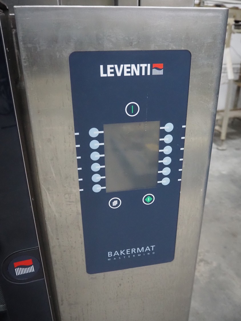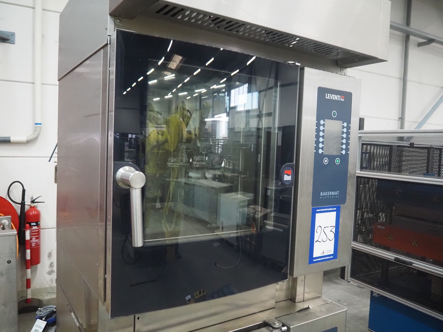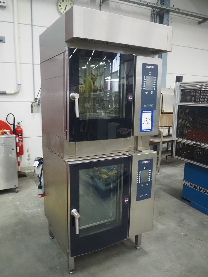 Leventi double stacked combi steamer with hood, 5 and 6 floors, dimensions each floor: 600 mm x 400 mm, total dimensions: 1050 mm x 900 mm x 2210 mm. Missing cover.