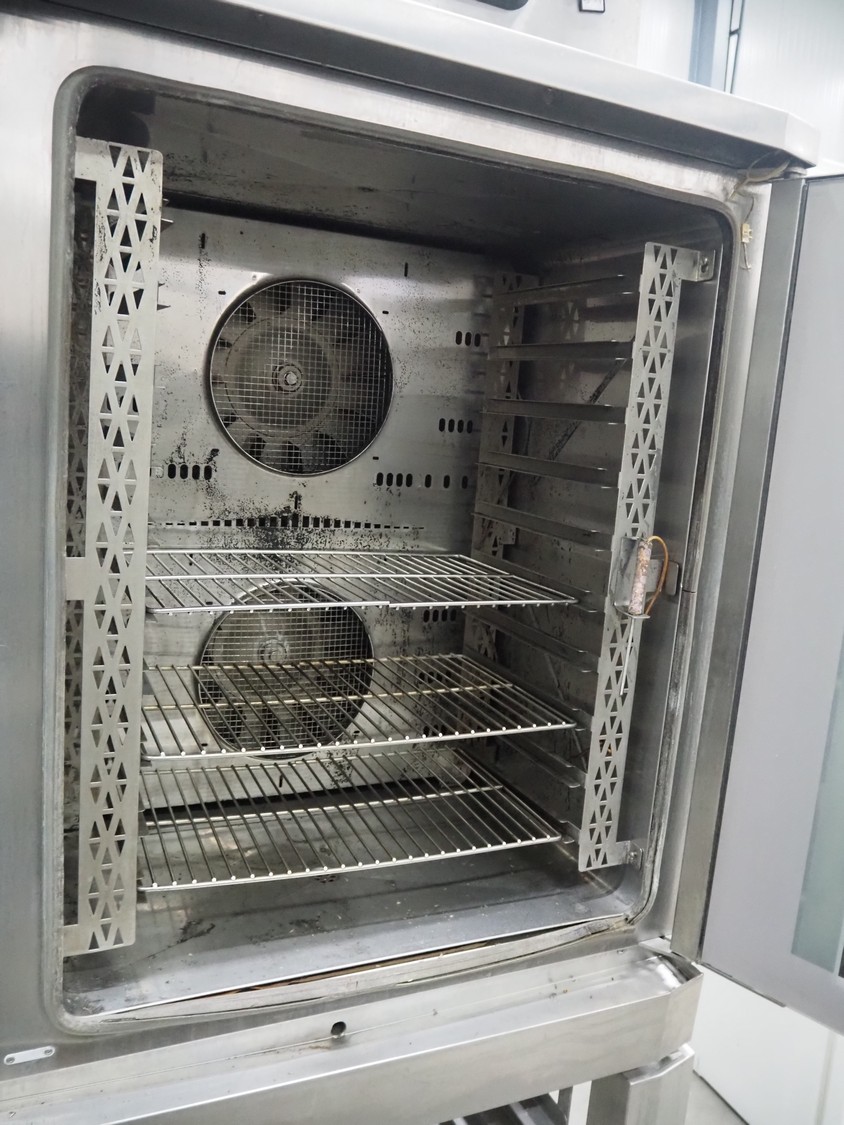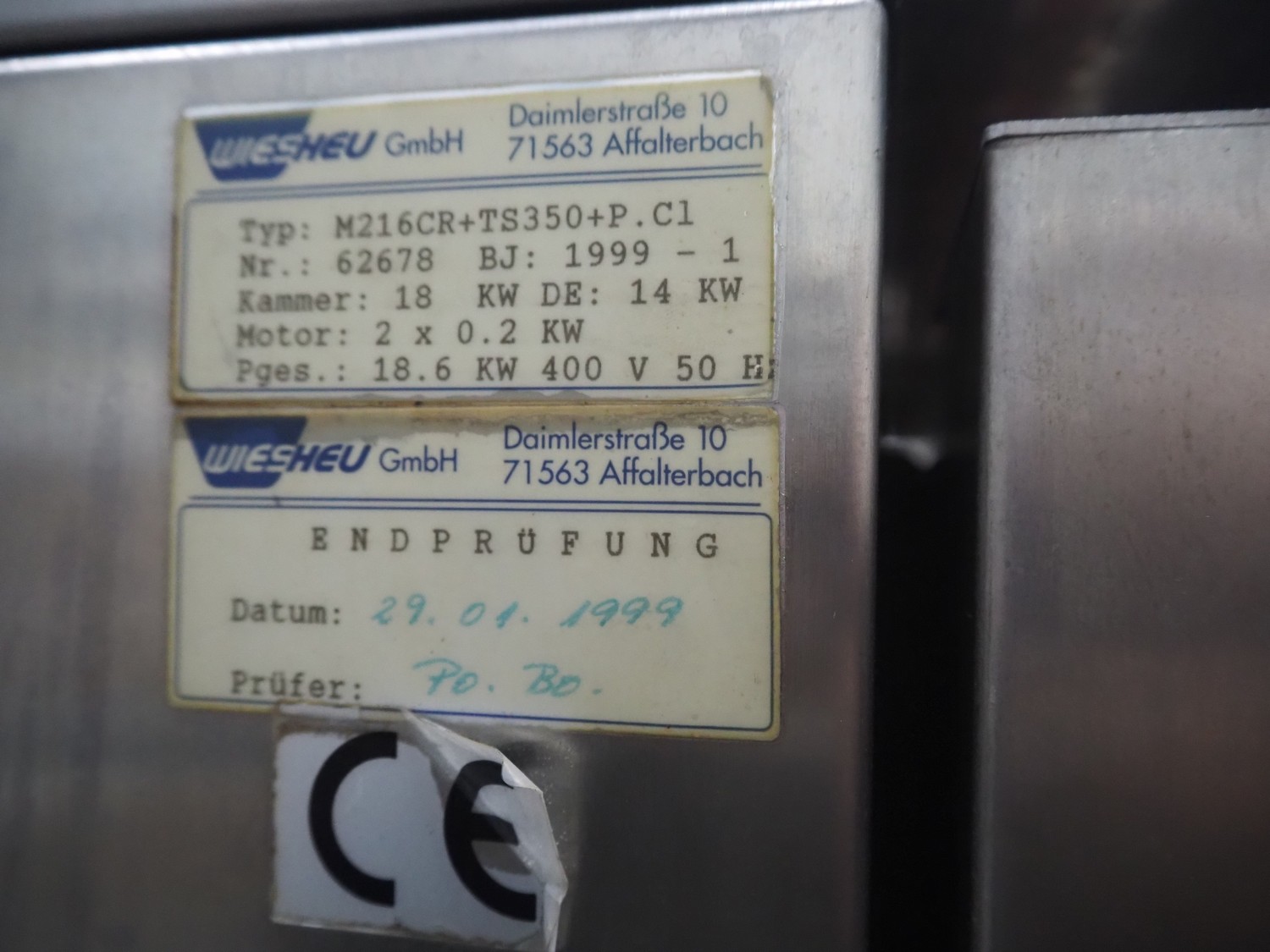 Wiesheu GmbH mobile combi steamer, type: M216CR+TS350+P.C1, number: 62678, year of construction: 1999, 400 V, 50 Hz, 18.6 kW, 10 floors, dimensions each floor: 520 mm x 330 mm, total dimensions: 950 mm x 870 mm x 2050 mm.