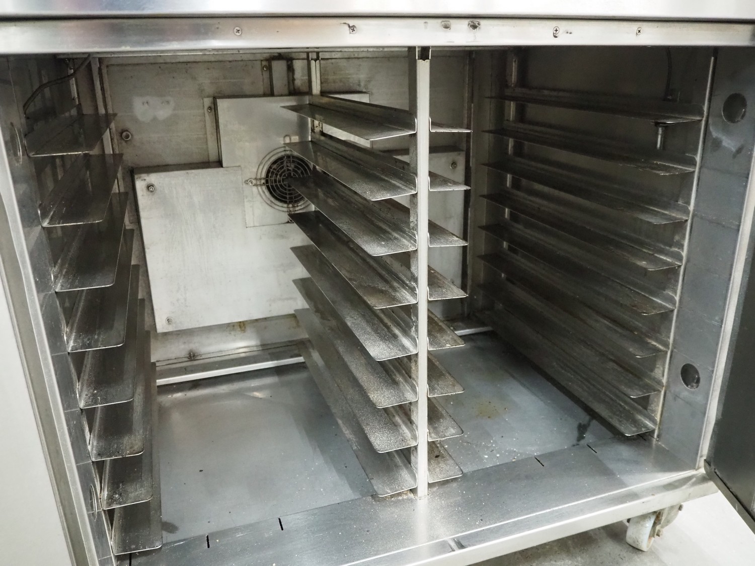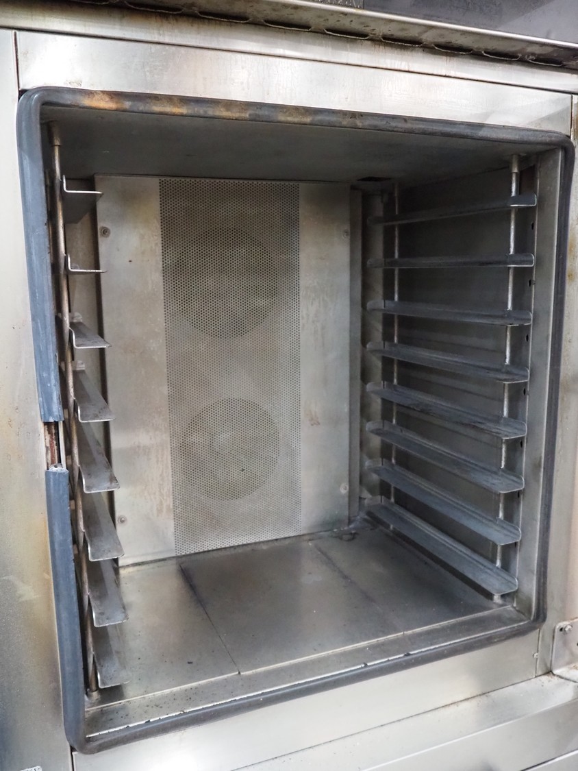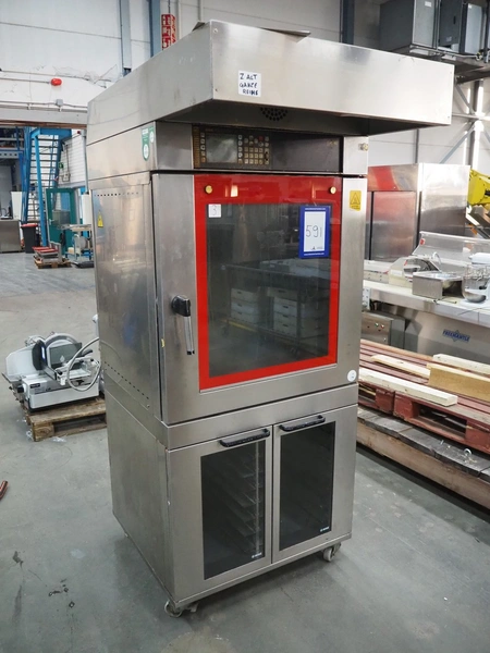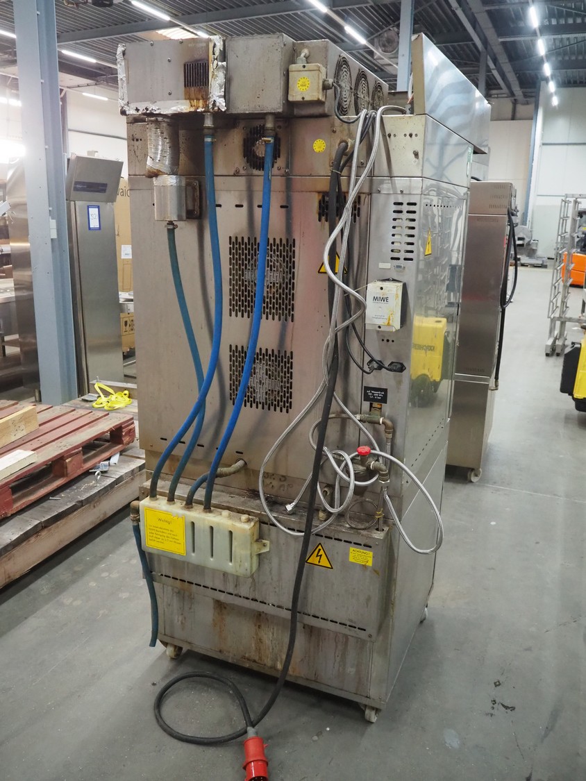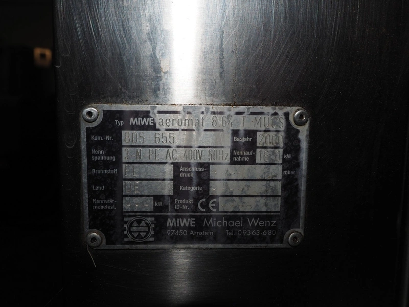 MIWE mobile oven, type: aeromat 8.64 T MUCS, number: 805 655, year of construction: 2000, 400 V, 3 Ph, 50 Hz, 16 kW, 8 floors, dimensions each floor: 650 mm x 400 mm, total dimensions: 1350 mm x 900 mm x 2100 mm.