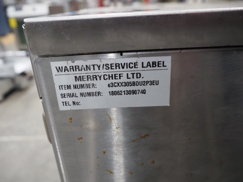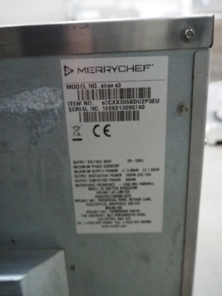 Merrychef turbo oven, model: eikon e3, serial number: 1806213090740, 400 V, 2 Ph, 50 Hz, 2 floors, dimensions each floor: 330 mm x 300 mm, total dimensions: 630 mm x 590 mm x 550 mm.