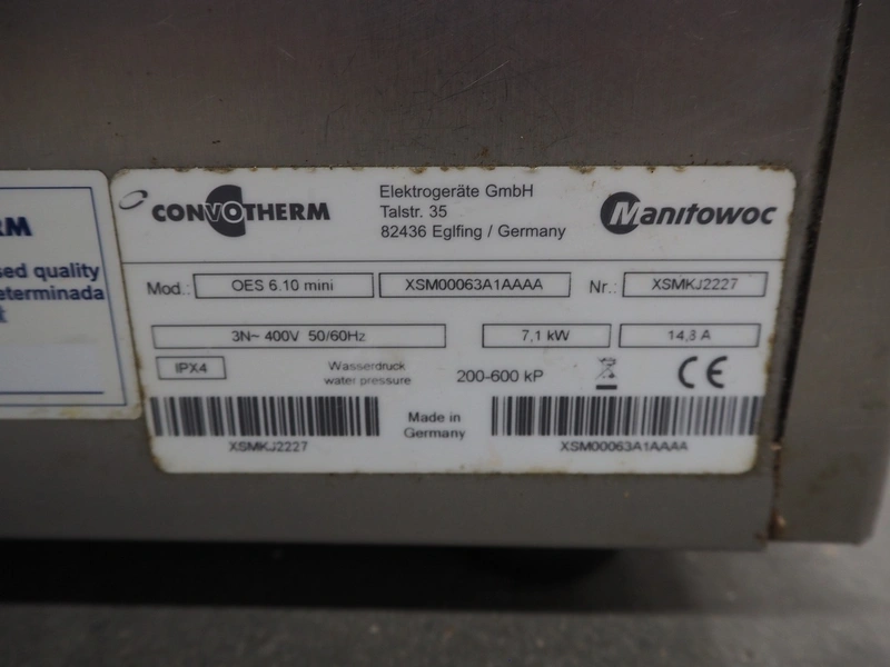 Convotherm combi steamer, model: OES 6.10 mini, number: XSMKJ2227, 400 V, 3 Ph, 50/60 Hz, 14.3 A, 7.1 kW, water pressure: 200-600 kP, 12 floors, dimensions each floor: 530 mm x 325 mm, total dimensions: 850 mm x 515 mm x 670 mm.