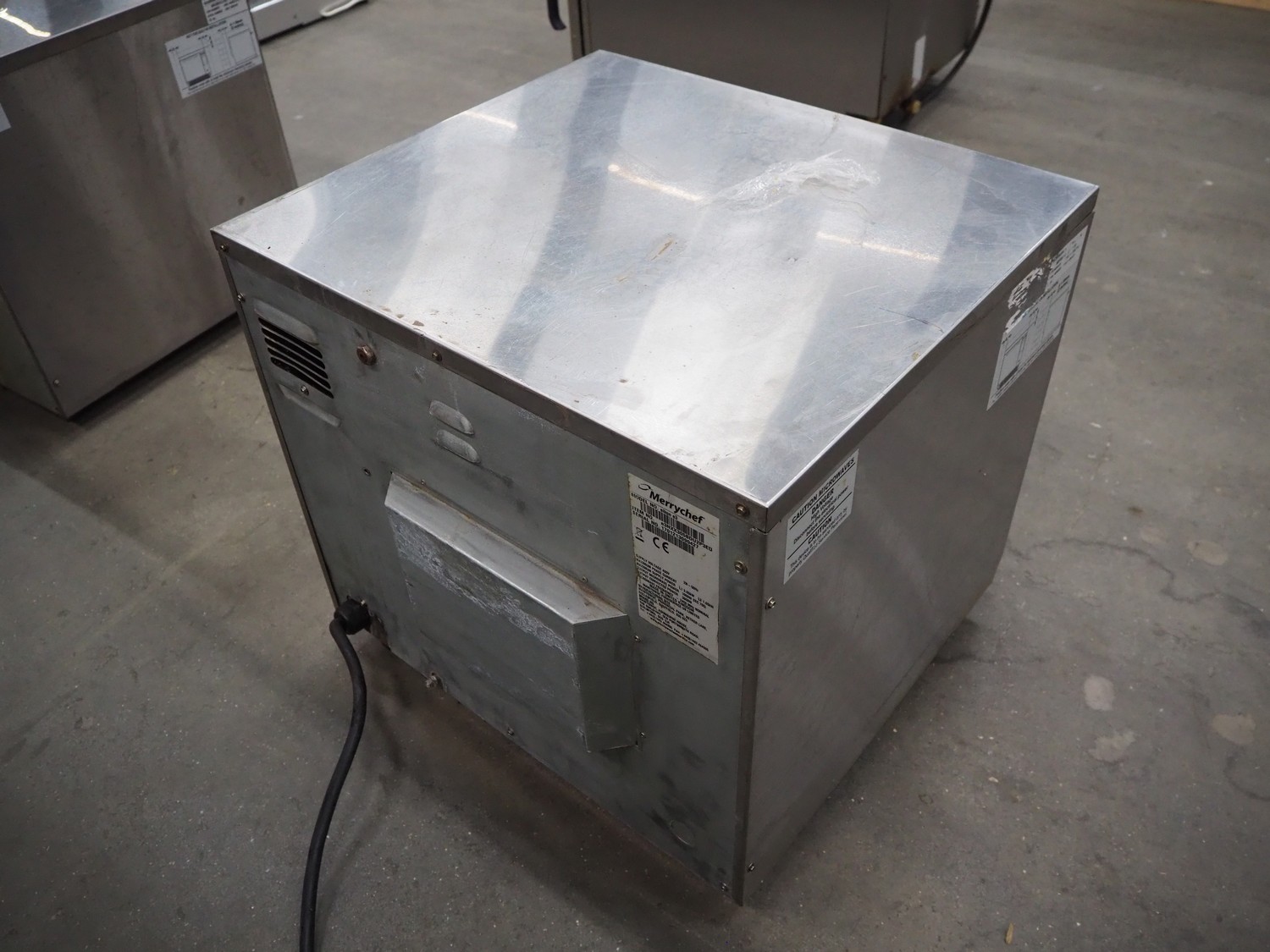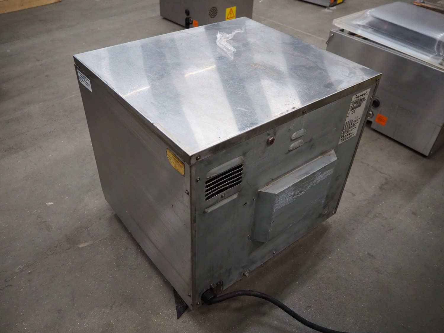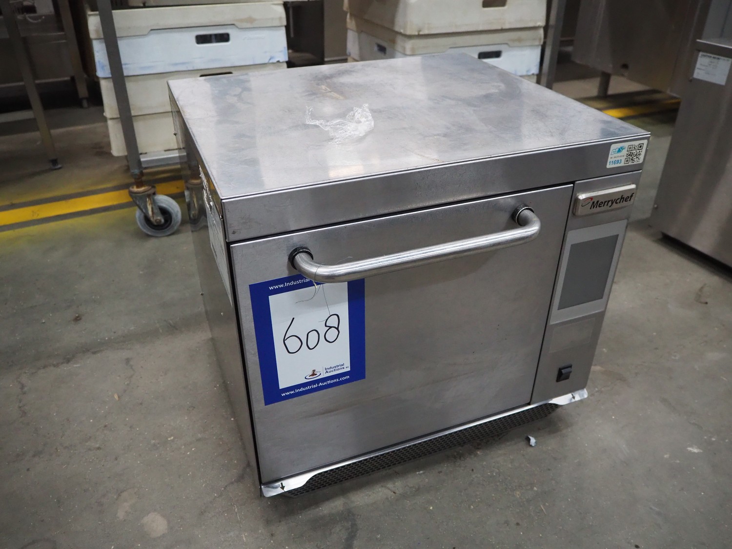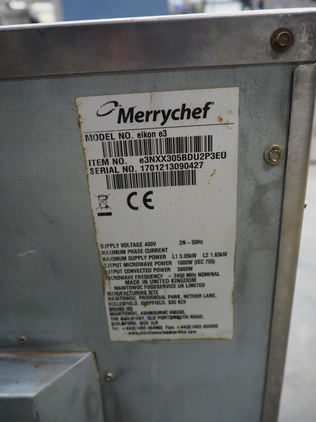 Merrychef turbo oven, model: eikon e3, serial number: 1701213090427, 400 V, 2 Ph, 50 Hz, 2 floors, dimensions each floor: 330 mm x 300 mm, total dimensions: 630 mm x 590 mm x 550 mm.