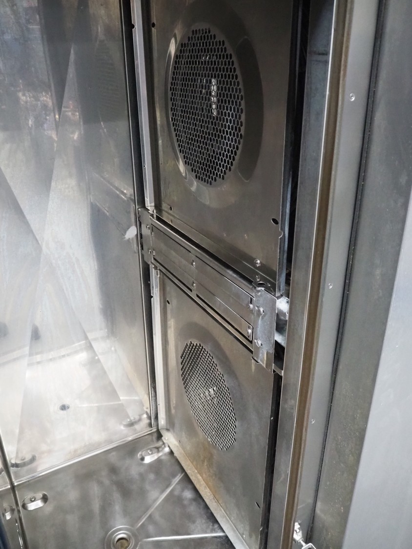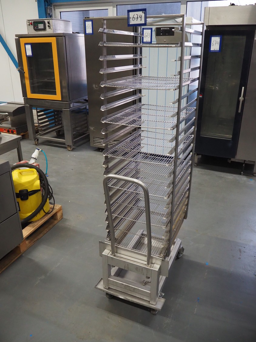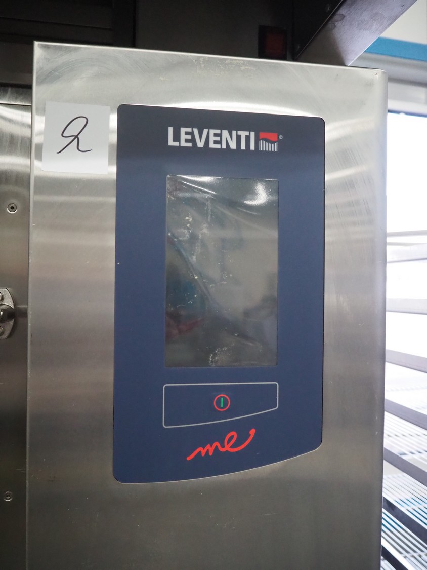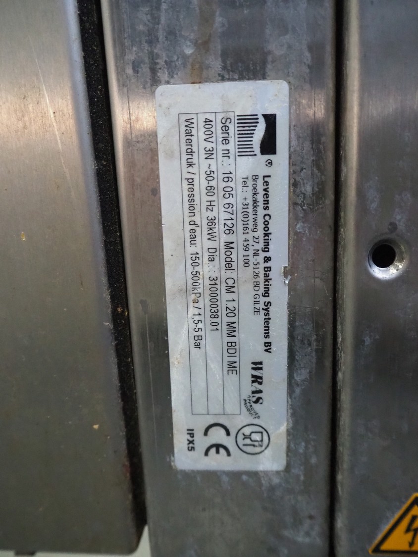 Leventi combi steamer, model: CM 1.20 MM BDI ME, serial number: 16 05 67126, 400 V, 3 Ph, 50/60 Hz, 36 kW, total dimensions: 910 mm x 910 mm x 2150 mm. Including s/s trolley, 20 floors, dimensions each floor: 600 mm x 400 mm.