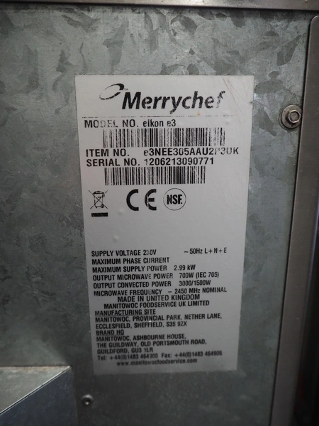 Merrychef high speed oven, model: eikon e3, item number: e3NEE305AAU2P3UK, serial number: 1206213090771, 2 floors, dimensions each floor: 330 mm x 250 mm, total dimensions: 600 mm x 600 mm x 560 mm.