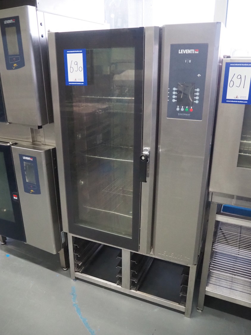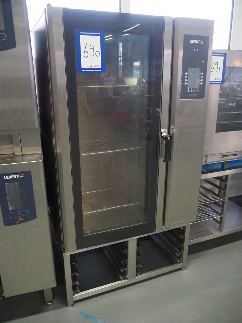 Leventi combi steamer on s/s rack, type: BM MM Q4, serial number: 069020064, year of construction: 2007, 380/415 V, 3 Ph, 50/60 Hz, 12 floors, dimensions each floor: 410 mm x 600 mm, total dimensions: 960 mm x 880 mm x 1820 mm.