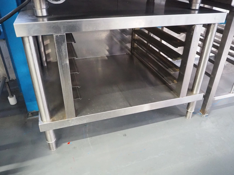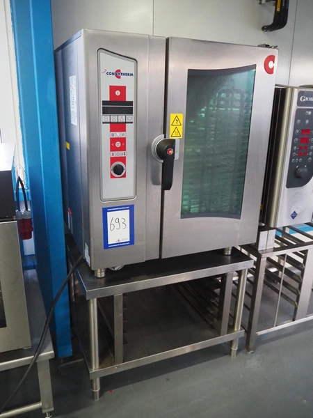Convotherm combi steamer on s/s rack, type: OES 10.10, number: FS301003000A00, 400 V, 3 Ph, 50/60 Hz, 26.3 A, 19.8 kW, 11 floors, dimensions each floor: 530 mm x 320 mm, total dimensions: 900 mm x 930 mm x 1800 mm.