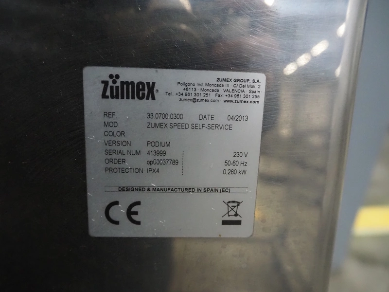 Zumex mobile juicer, model: ZUMEX SPEED SELF-SERVICE, serial number: 413999, year of construction: 04/2013, 230 V, 50/60 Hz, 0.280 kW, dimensions: 700 mm x 680 mm x 1750 mm.