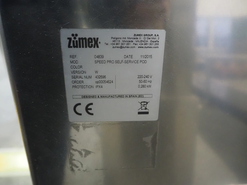 Zumex mobile juicer, model: SPEED PRO SELF-SERVICE, serial number: 432596, year of construction: 11-2015, 220/240 V, 50/60 Hz, 0.280 kW, dimensions: 700 mm x 680 mm x 1750 mm.