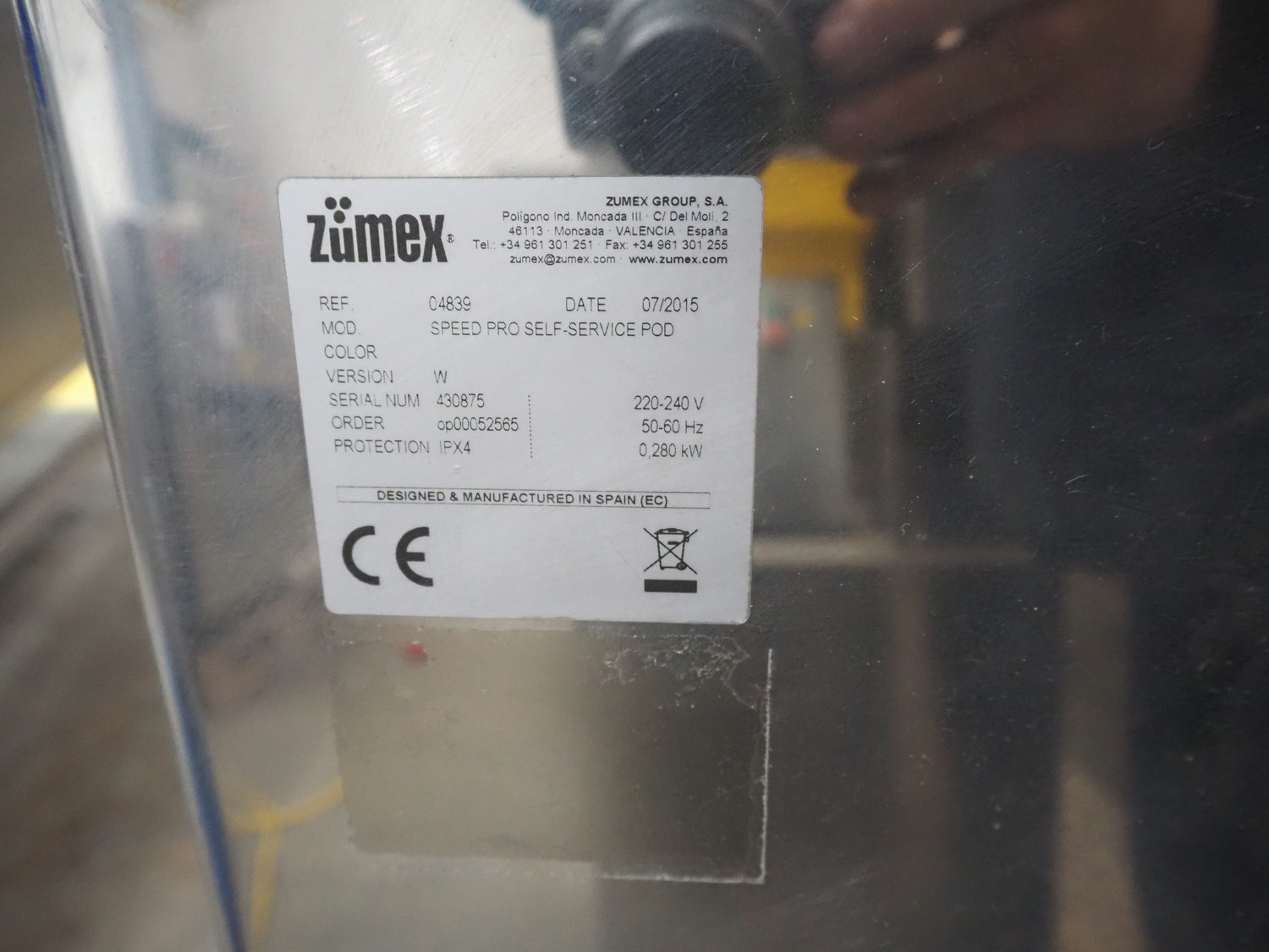 Zumex mobile juicer, model: SPEED PRO SELF-SERVICE, serial number: 430875, year of construction: 07/2015, 220/240 V, 50/60 Hz, 0.280 kW, dimensions: 700 mm x 680 mm x 1750 mm.