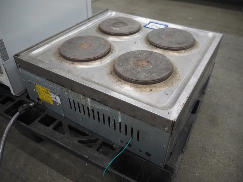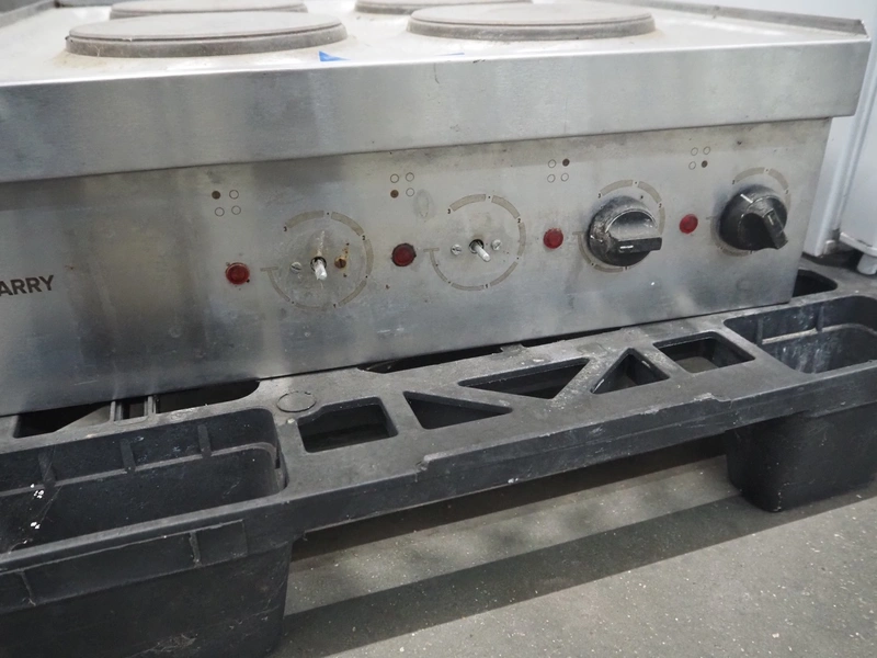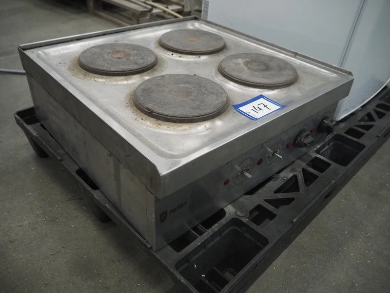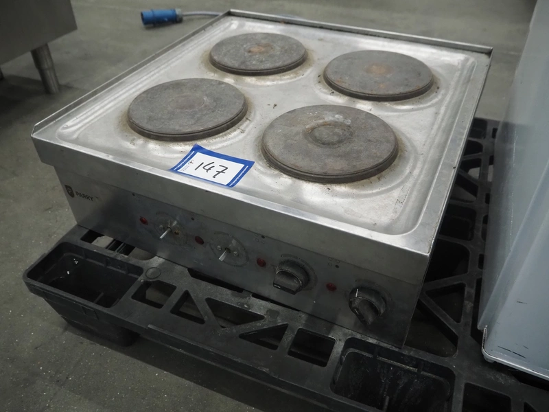 Parry 4 pits stove, model: N1871, serial number: 160160283, 240/415 V, 50 Hz, 8.5/12.5/29.2 A, 7 kW, dimensions: 600 mm x 610 mm x 220 mm. Missing 2 buttons.