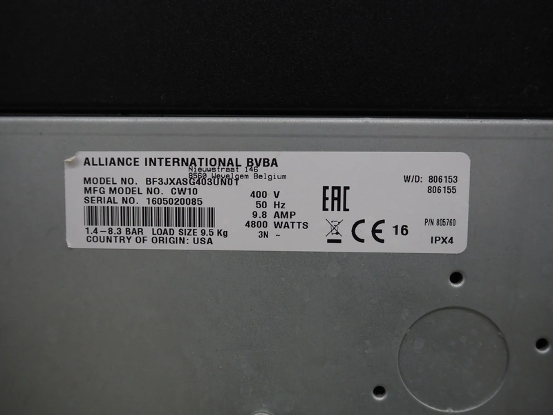 Alliance International Bvba washing machine, model: BF3JXASG403EN01, serial number: 1605020085, 400 V, 3 Ph, 50 Hz, 9.8 A, 4800 Watt, dimensions: 730 mm x 680 mm x 1110 mm.