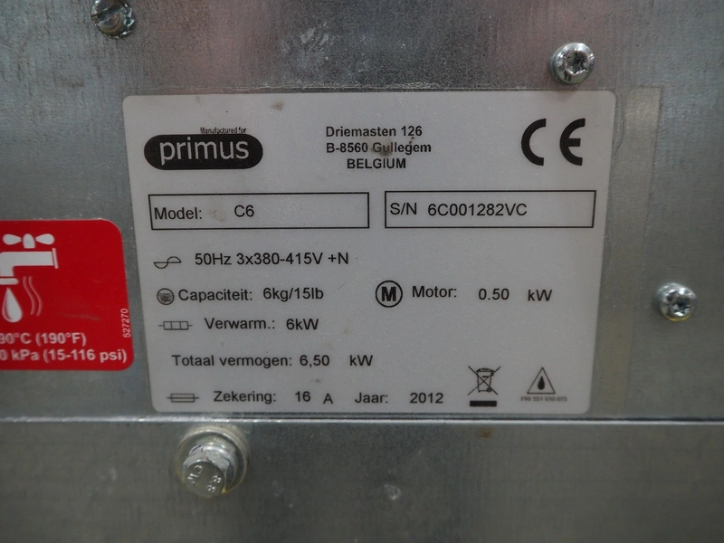 Primus washing machine, model: C6, serial number: 6C001282VC, year of construction: 2012, 380/415 V, 3 Ph, 50 Hz, 16 A, 6.5 kW, capacity: 6 kg, dimensions: 690 mm x 630 mm x 1090 mm.