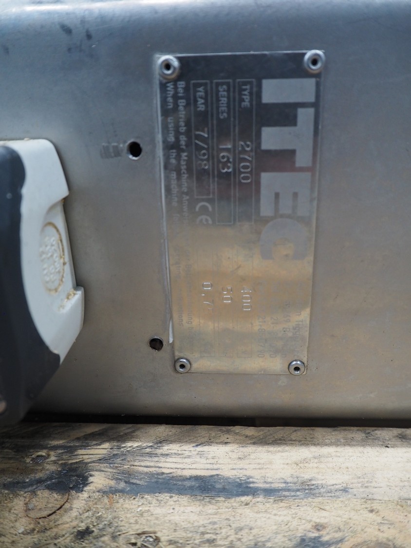 Itec lifter for 200 liter meat bins, type: 2700, series: 163, year of construction: 7/98, 400 V, 50 Hz, lifting height: 2130 mm, total dimensions: 3150 mm x 1000 mm x 1150 mm. Incomplete.