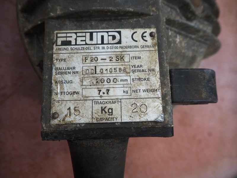 Freund balancer, type: F20-2SK, serial number: 010588, year of construction: 2000, maximum length: 2000 mm, weight: 7.7 kg, capacity: 15 kg.